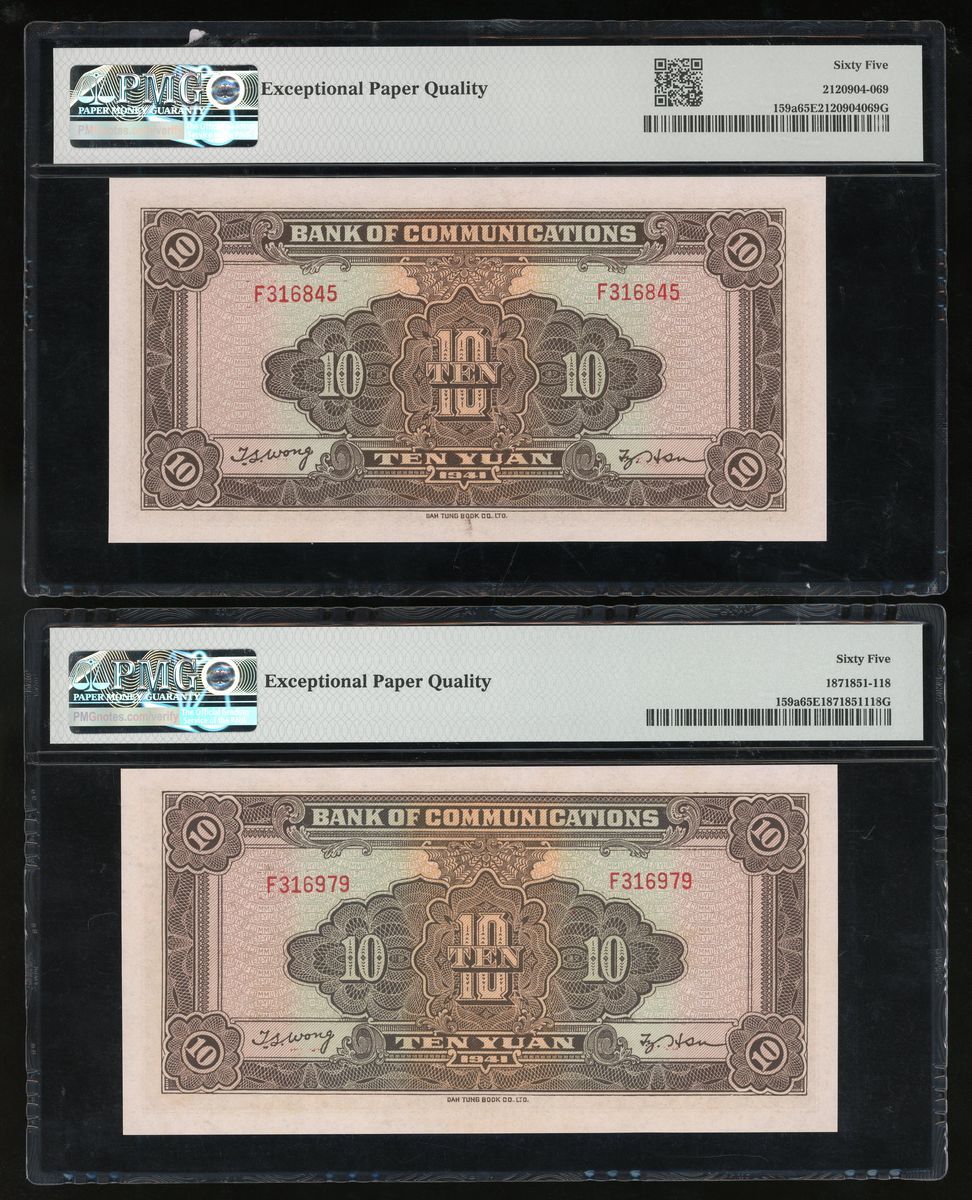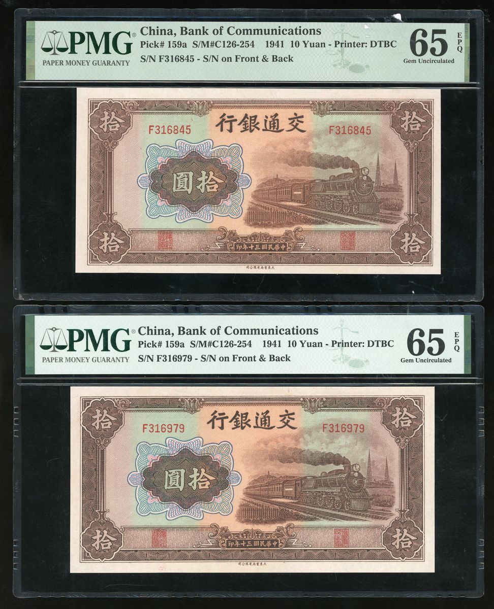 Bank of Communications, China, 10 yuan (2), Year 30 (1941), (Pick 159a), both PMG 65EPQ (2)