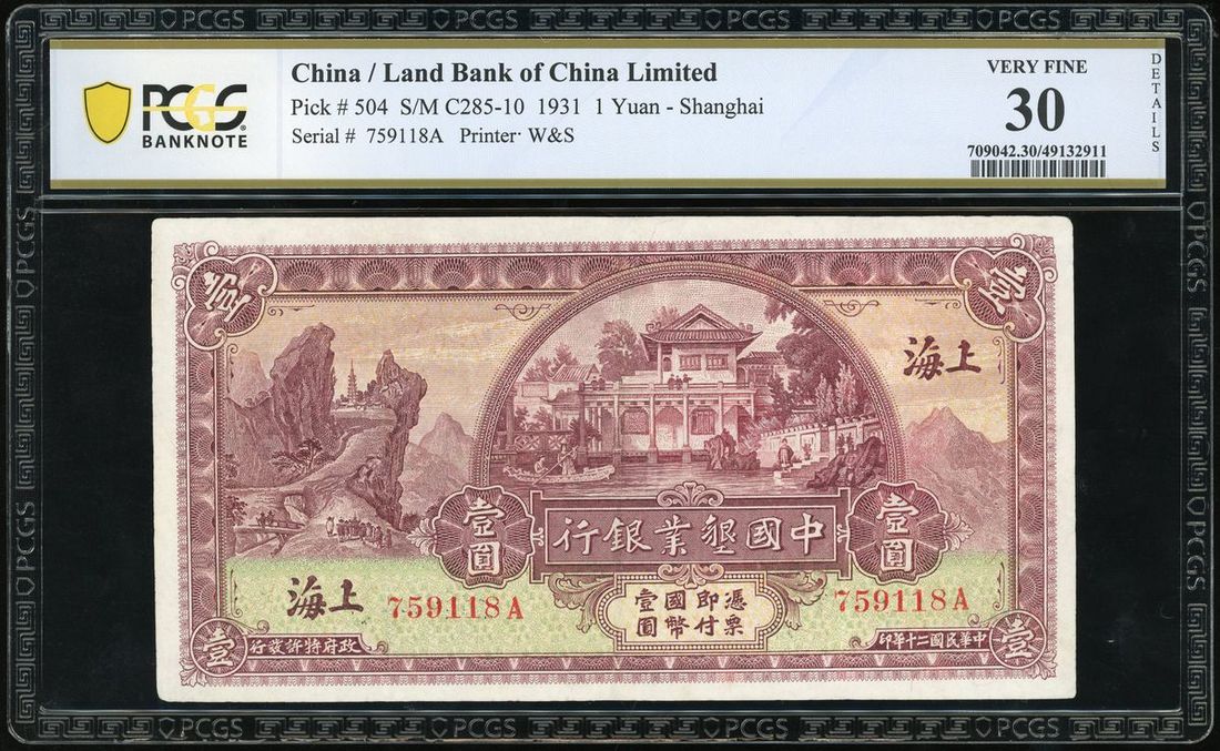 Land Bank of China, 1 yuan, Year 20 (1931), serial number 759118A, (Pick 504), PCGS 30 DETAILS (minor repairs), very fine