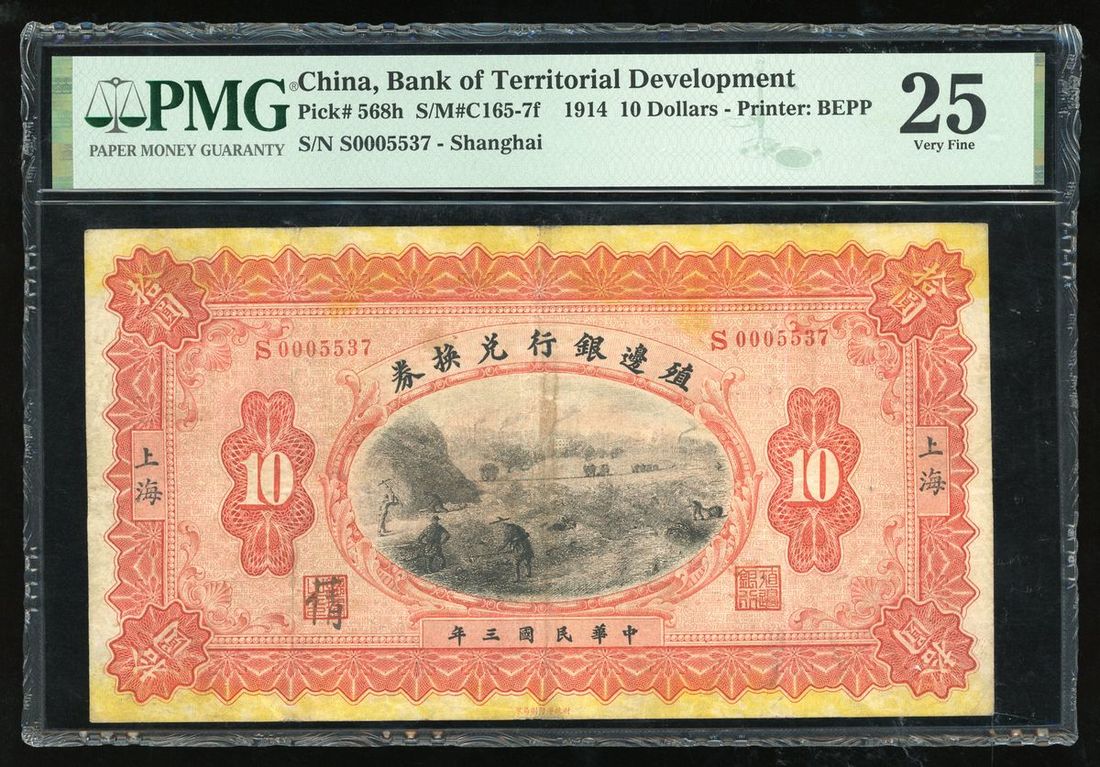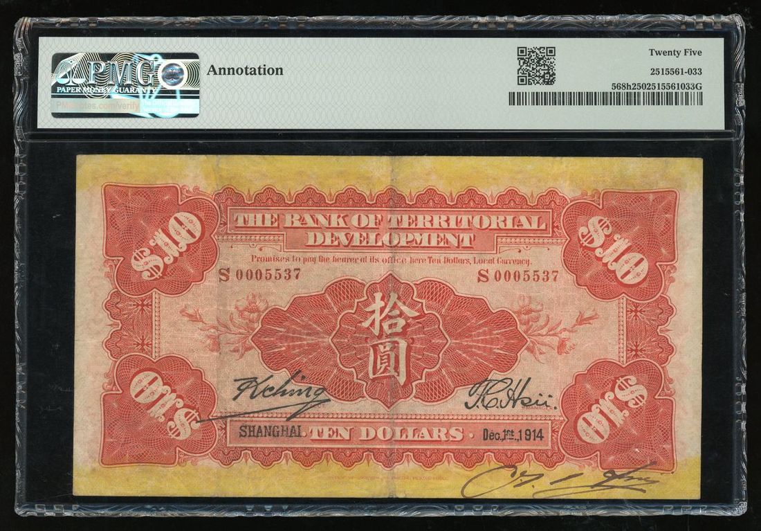 Bank of Territorial Developement, 10 yuan, Shanghai, Year 3 (1914), serial number S0005537, (Pick 568h), PMG 25, annotation.