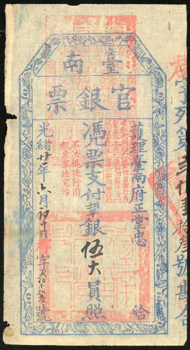 Taiwan, China, Tianan Provincial Office, First Issue, 5 dollars, 21st Year of Guangxu (1895), serial number 213, (Pick 1905c), fine. An above average example of this ever popular early issue.