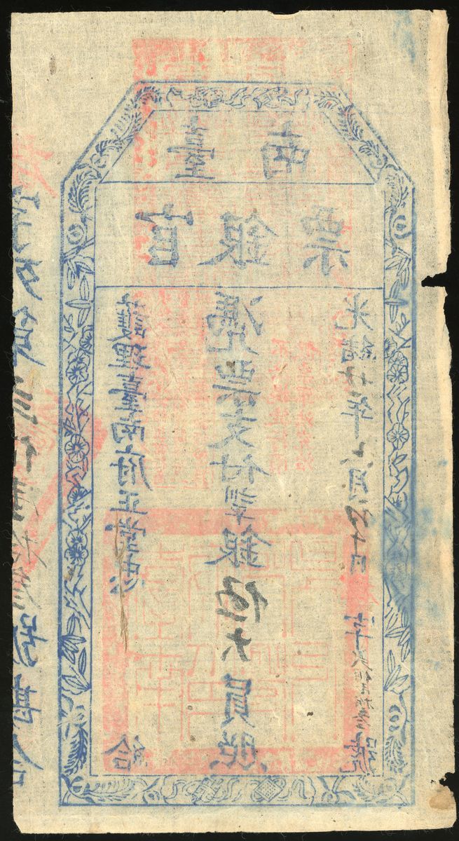 光緒二十一年臺南官銀票伍大員,郡字第213號,F品相,此熱門早期版式中屬於中上品相