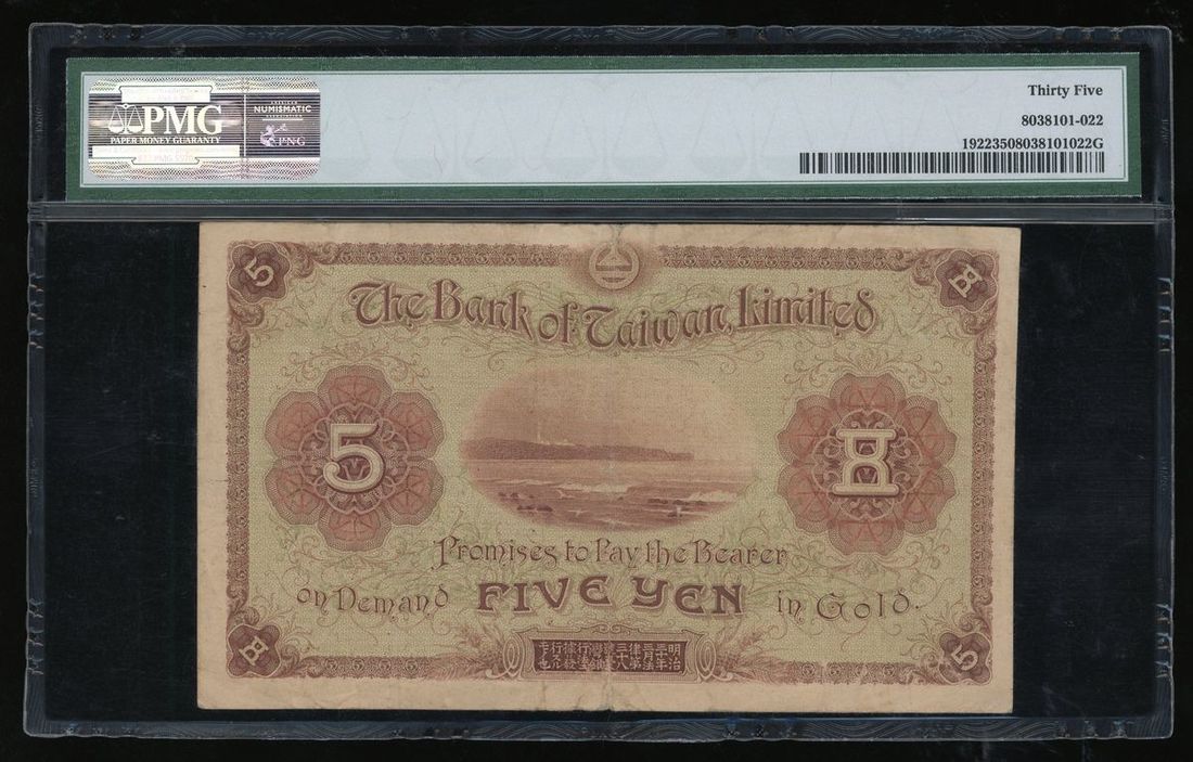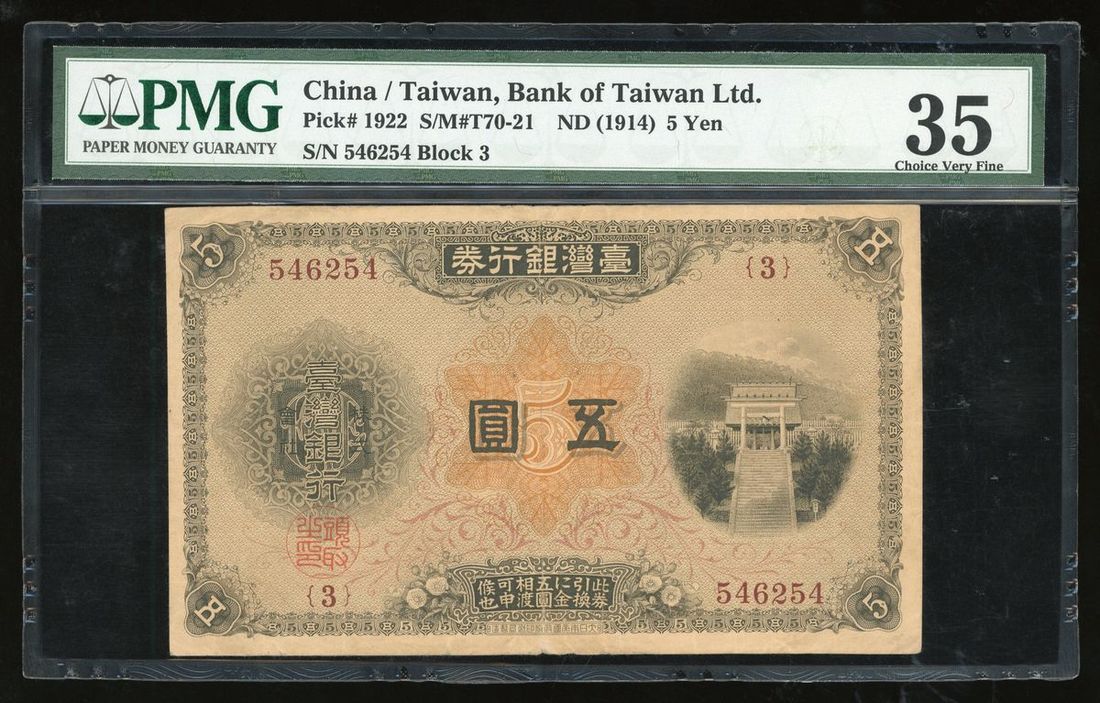 Bank of Taiwan, 5 yen, ND (1914), serial number 546254, block 2, (Pick 1922), PMG 35. An early type