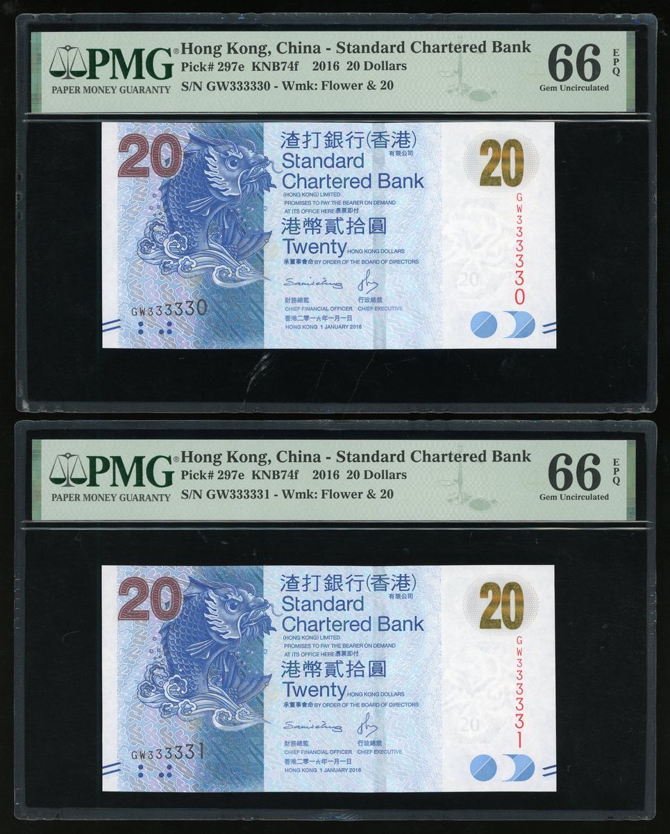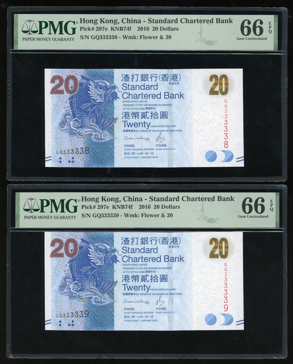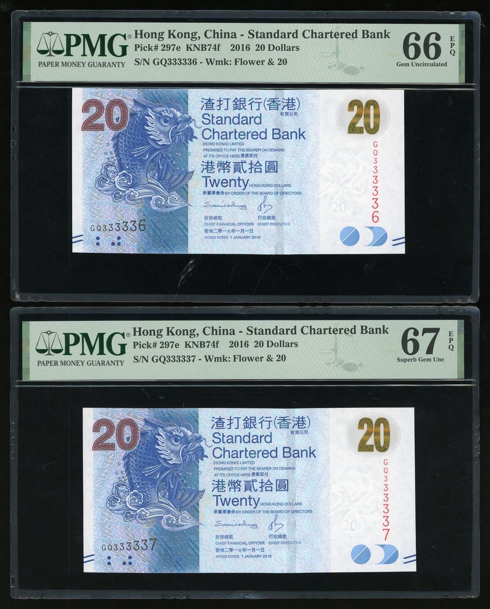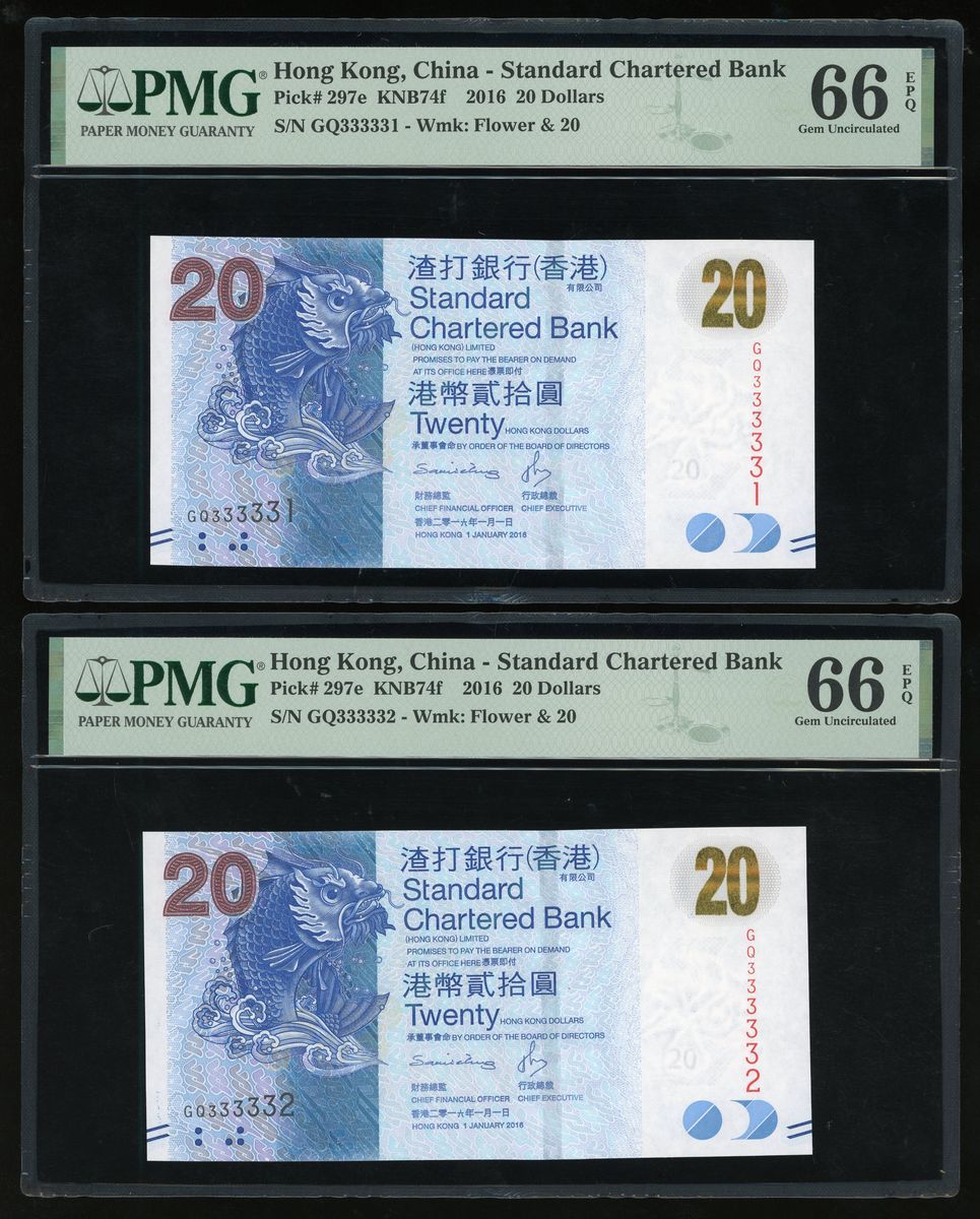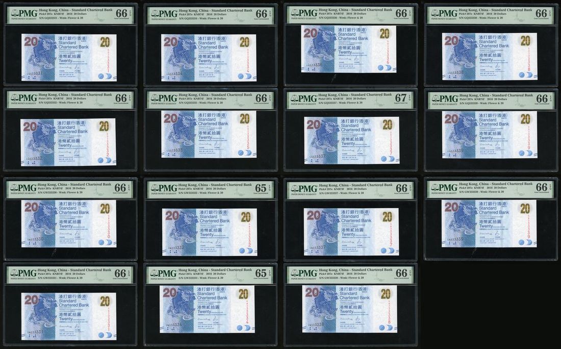 Standard Chartered Bank, Hong Kong, a group of near fancy serial number $20, 2016, serial number, GQ333331, GQ333332, GQ333334, GQ333335, GQ333336, GQ333337, GQ333338, GQ333339, GW333330, GW333331, GW333332, GW333334, GW333337, GW333338, GW333339,