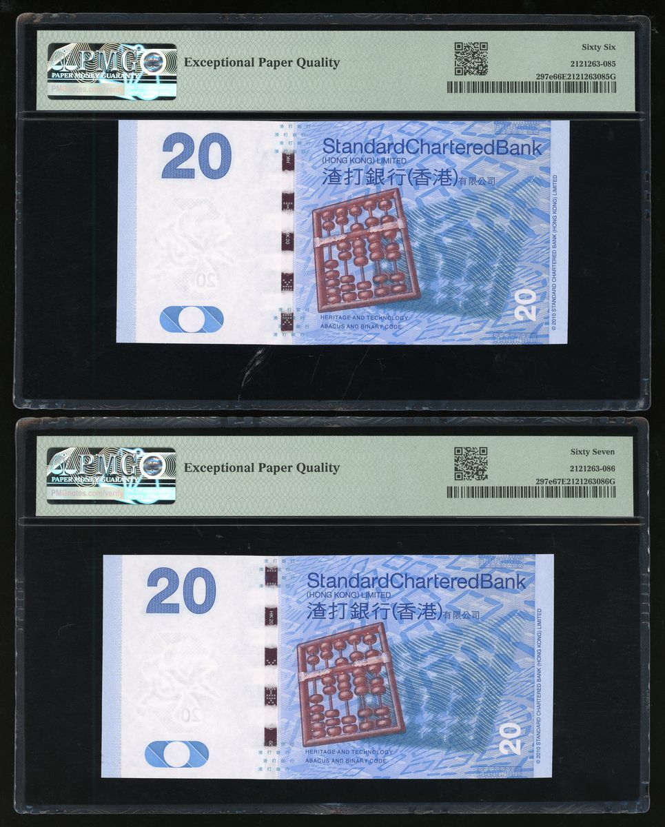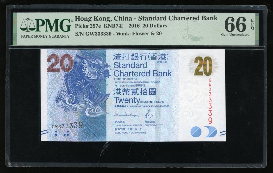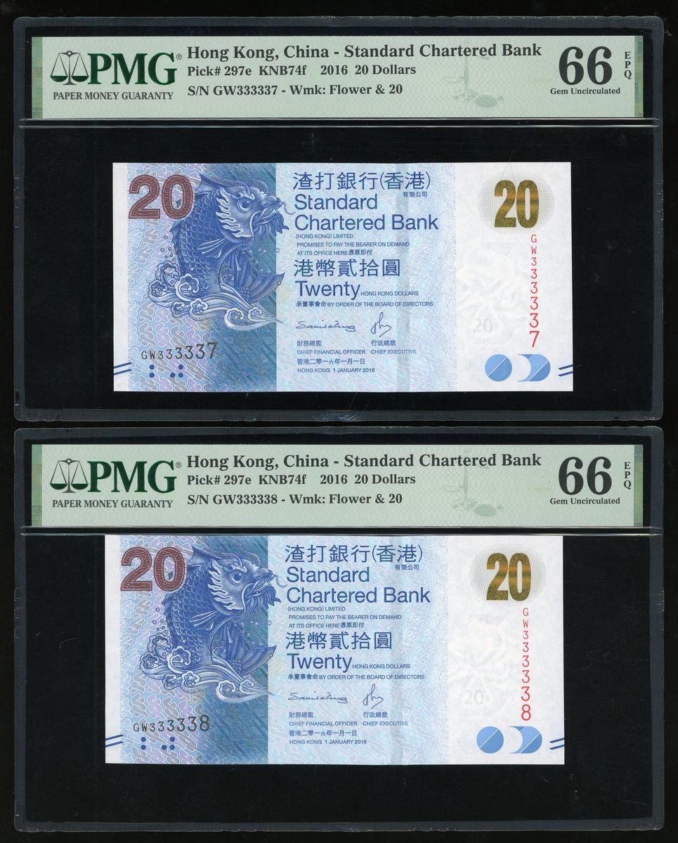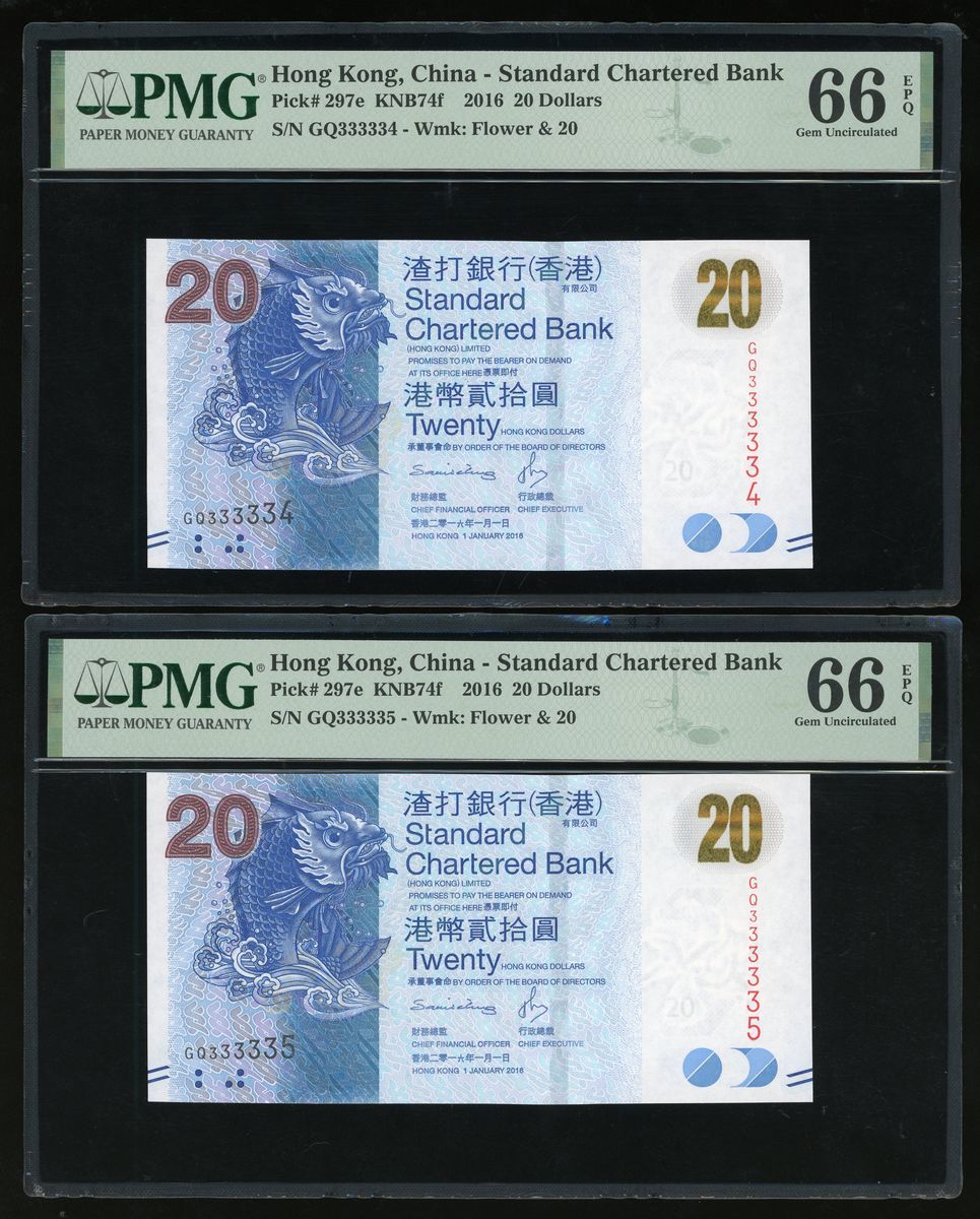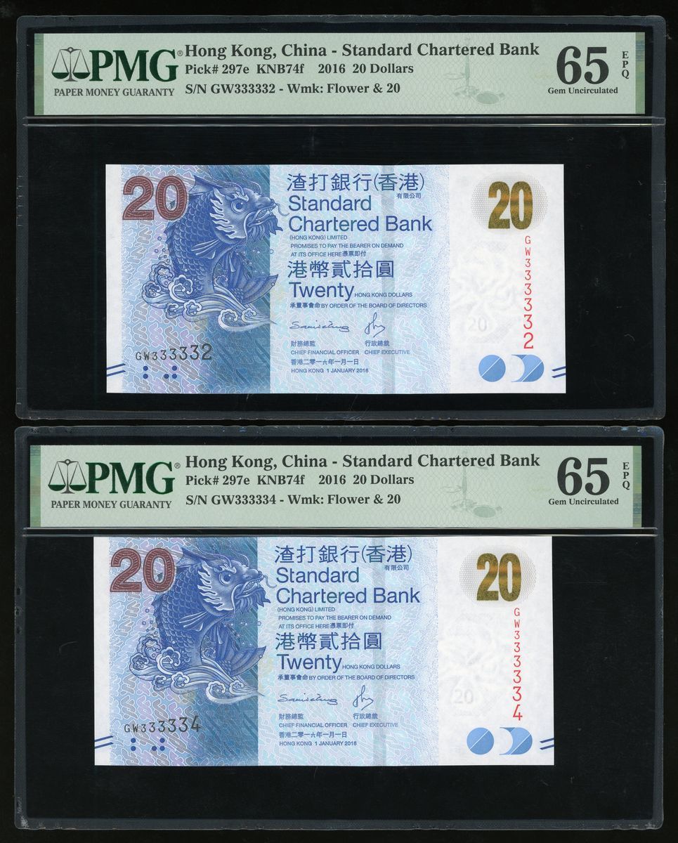 Standard Chartered Bank, Hong Kong, a group of near fancy serial number $20, 2016, serial number, GQ333331, GQ333332, GQ333334, GQ333335, GQ333336, GQ333337, GQ333338, GQ333339, GW333330, GW333331, GW333332, GW333334, GW333337, GW333338, GW333339,