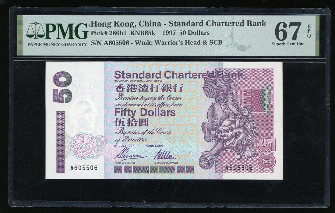 Standard Chartered Bank, Hong Kong, $50, 1.7.1997, radar serial number A 605506, (Pick 286b1), PMG 67EPQ Superb Gem Uncirculated