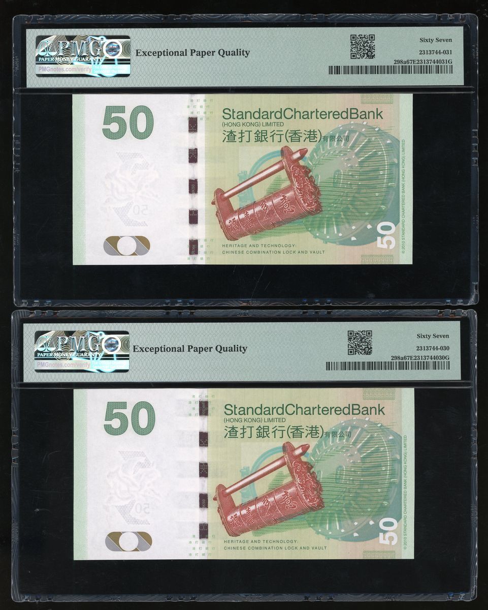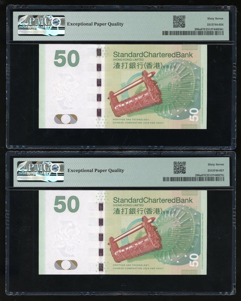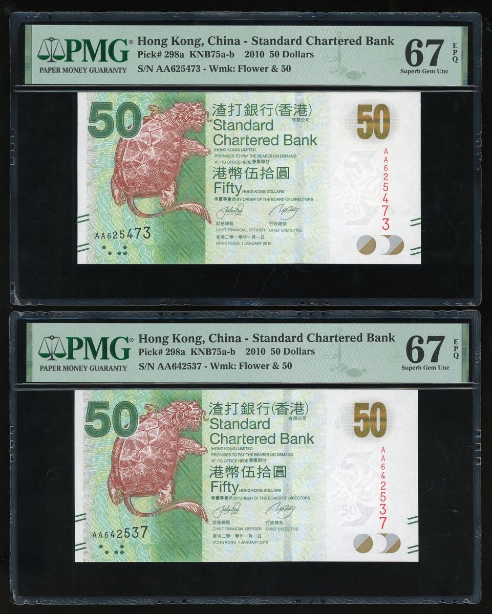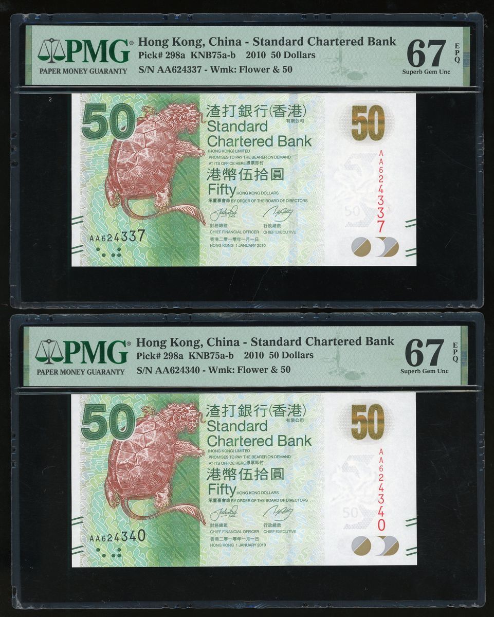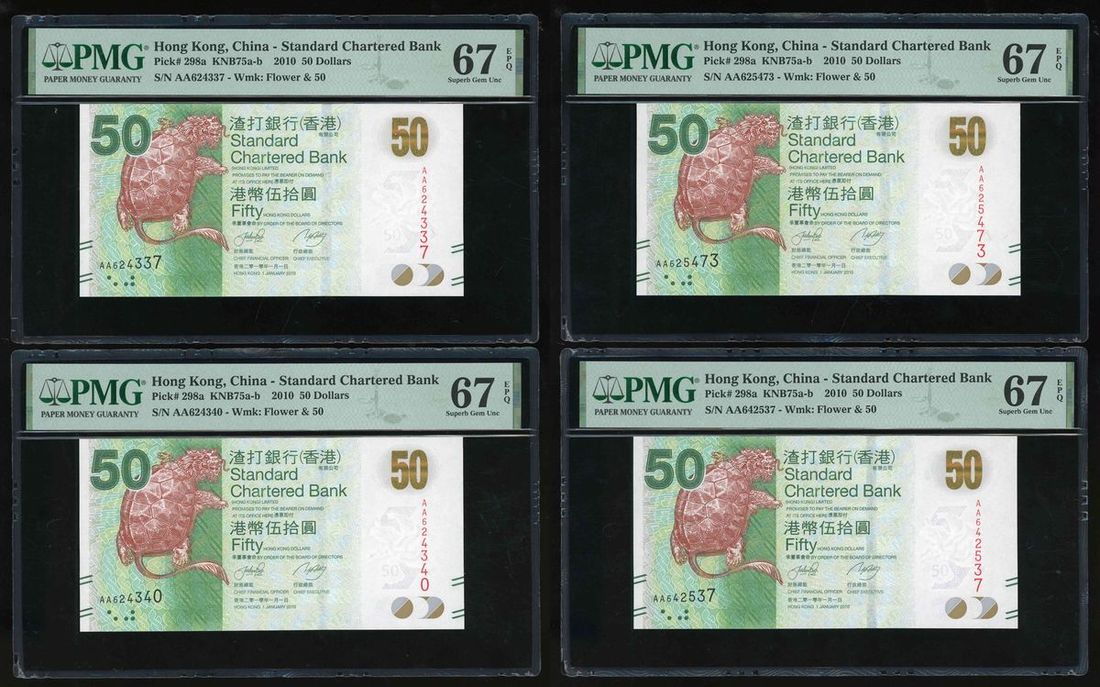 Standard Chartered Bank, Hong Kong, a group of 4x $50, 1.1.2010, including a pair of scrambled ladder serial numbers AA 642537, AA 625473, regular serial numbers AA 624340, AA 624337,