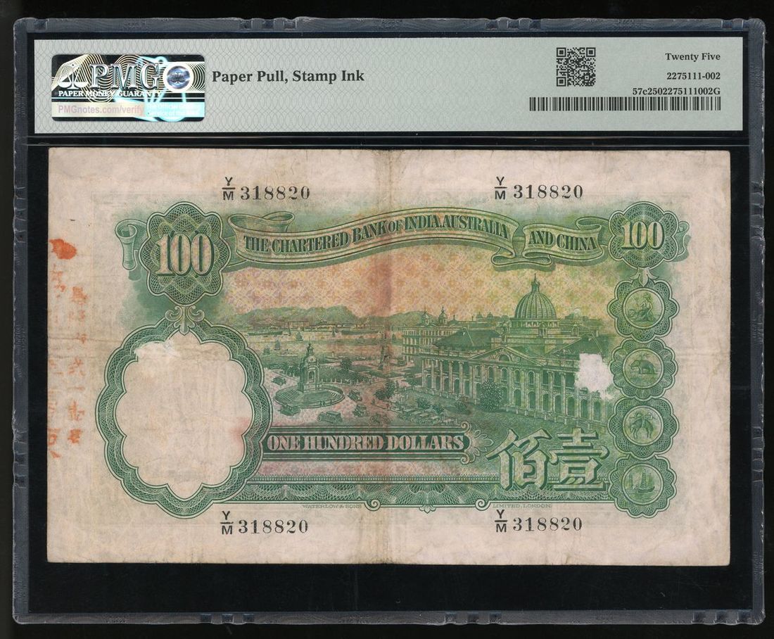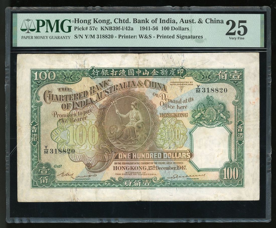 Chartered Bank of India, Australia & China, Hong Kong, $100, 15.12.1947, serial number Y/M 318820, (Pick 57c), PMG 25 Very Fine (Paper Pull, Stamp Ink), the always popular seated Britannia issue