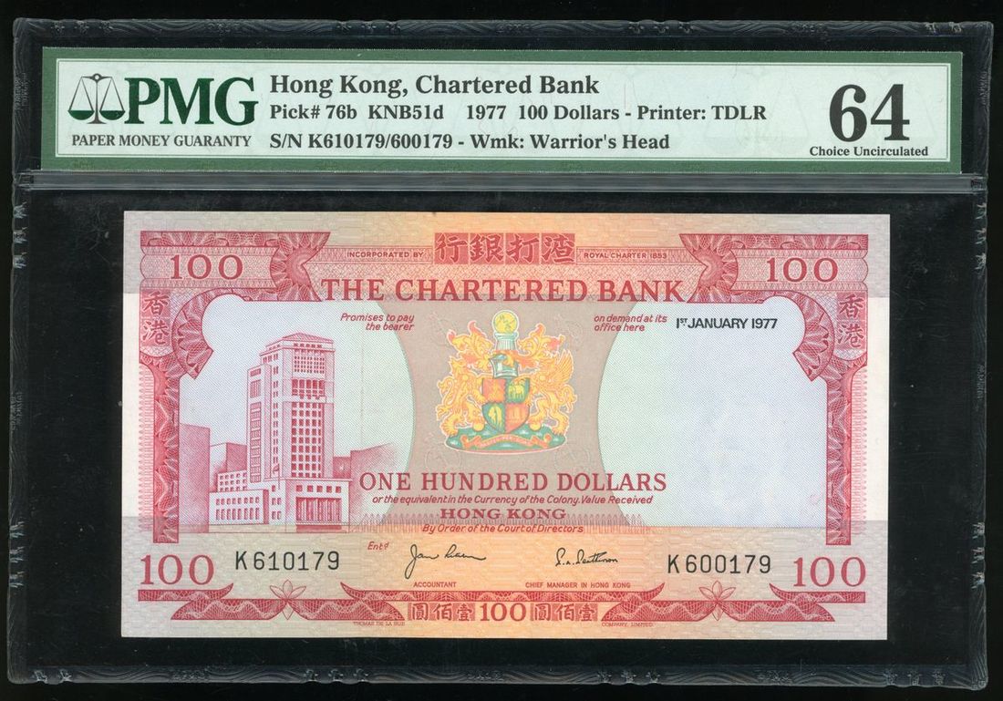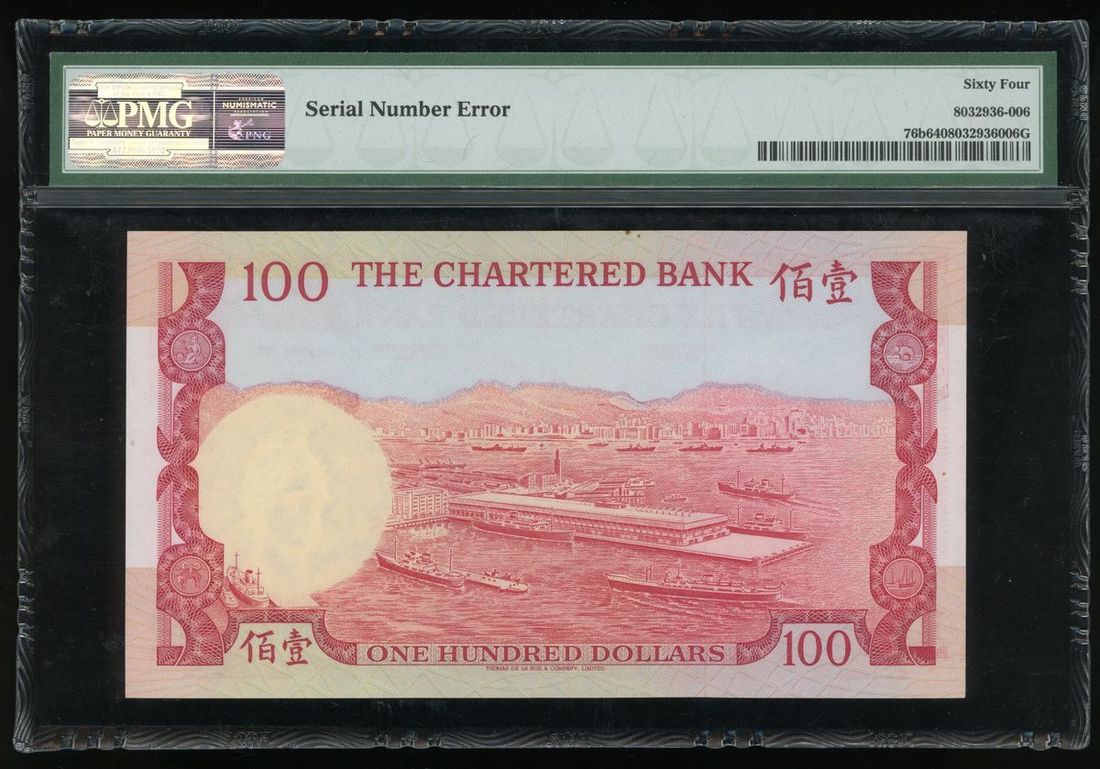 The Chartered Bank, Hong Kong, ERROR $100, 1.1.1977, mismatched serial number K 610179 / 600179, (Pick 76b), PMG 64 Choice Uncirculated (Serial Number Error). Rare error from the 1970s.