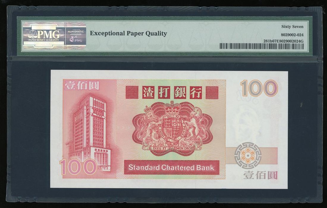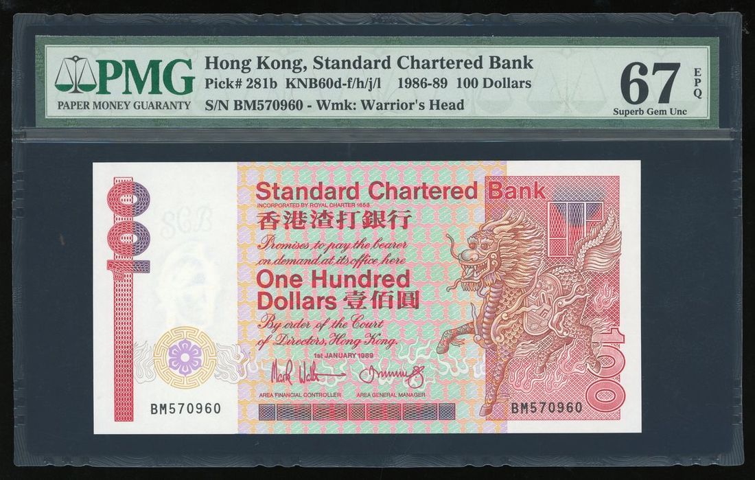 Standard Chartered Bank, Hong Kong, $100, 1.1.1989, serial number BM 570960, (Pick 281b), PMG 67EPQ Superb Gem Uncirculated