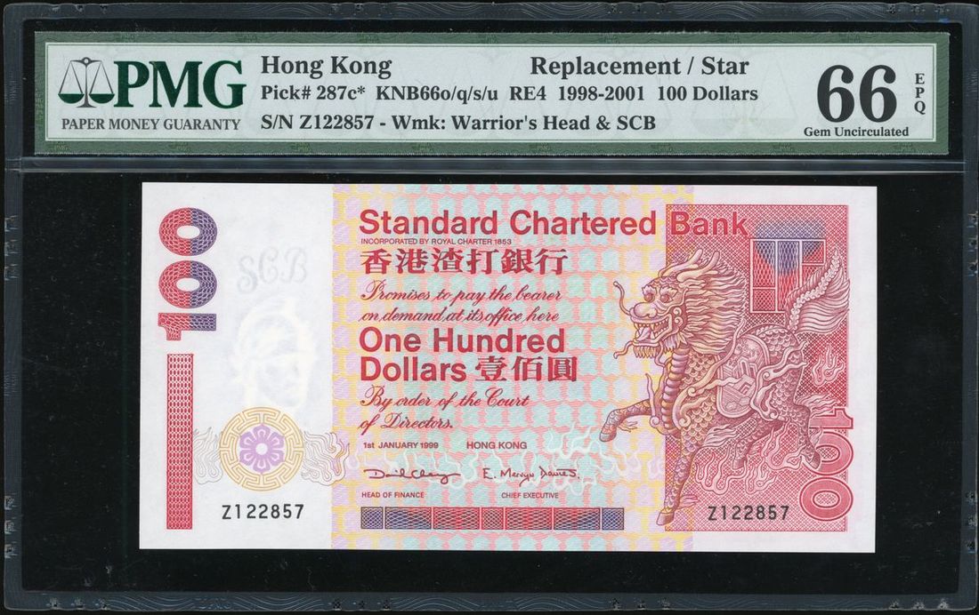 Standard Chartered Bank, Hong Kong, replacement $100, 1.1.1999, serial number Z122857, (Pick 287c*), PMG 66EPQ Gem Uncirculated.