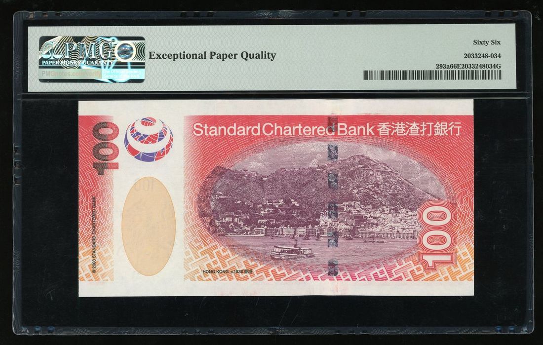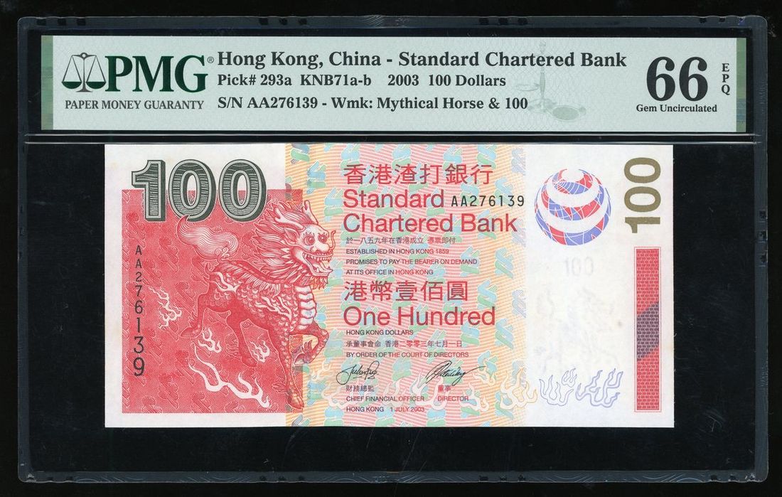 Standard Chartered Bank, Hong Kong, $100, 1.7.2003, serial number AA 276139, (Pick 293a), PMG 66EPQ Gem Uncirculated