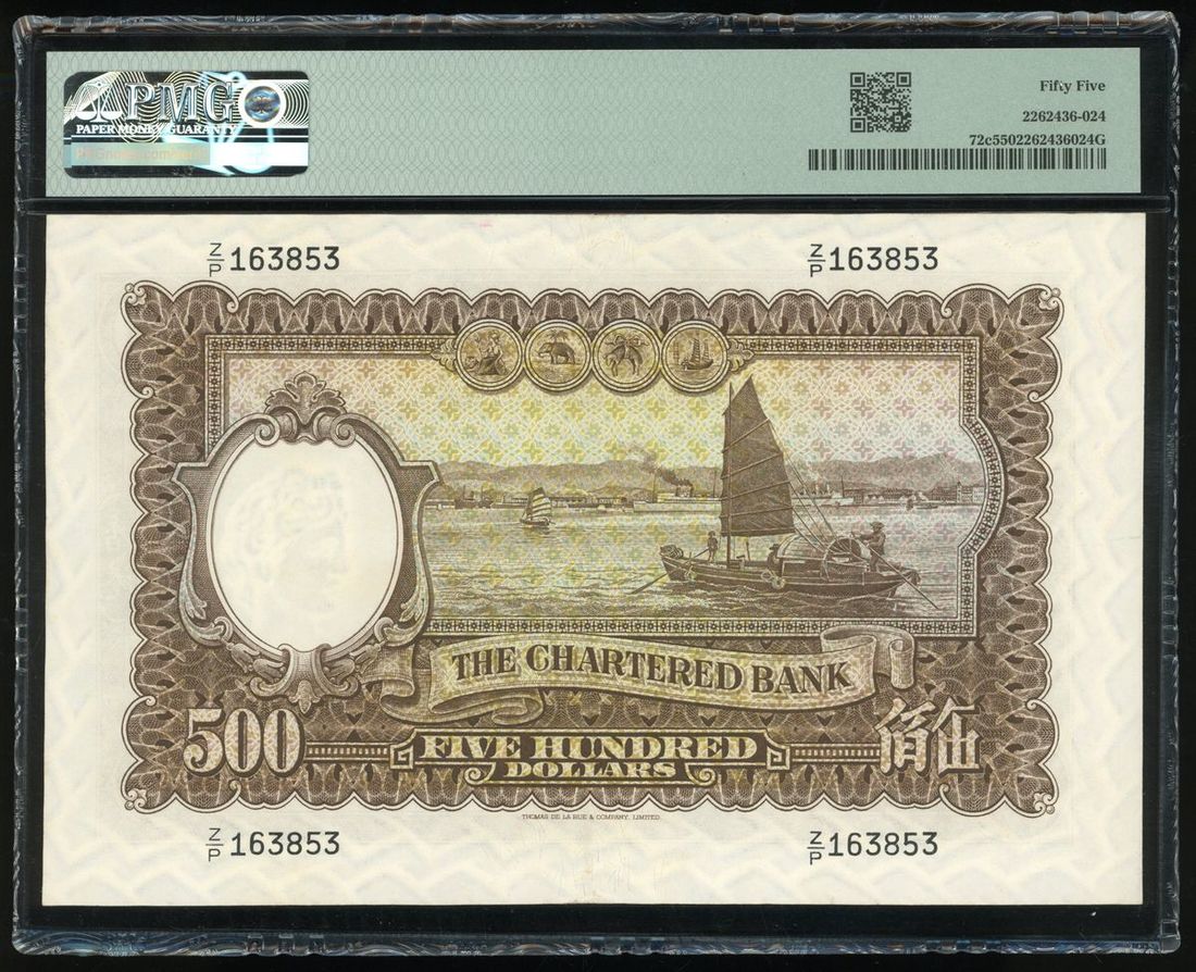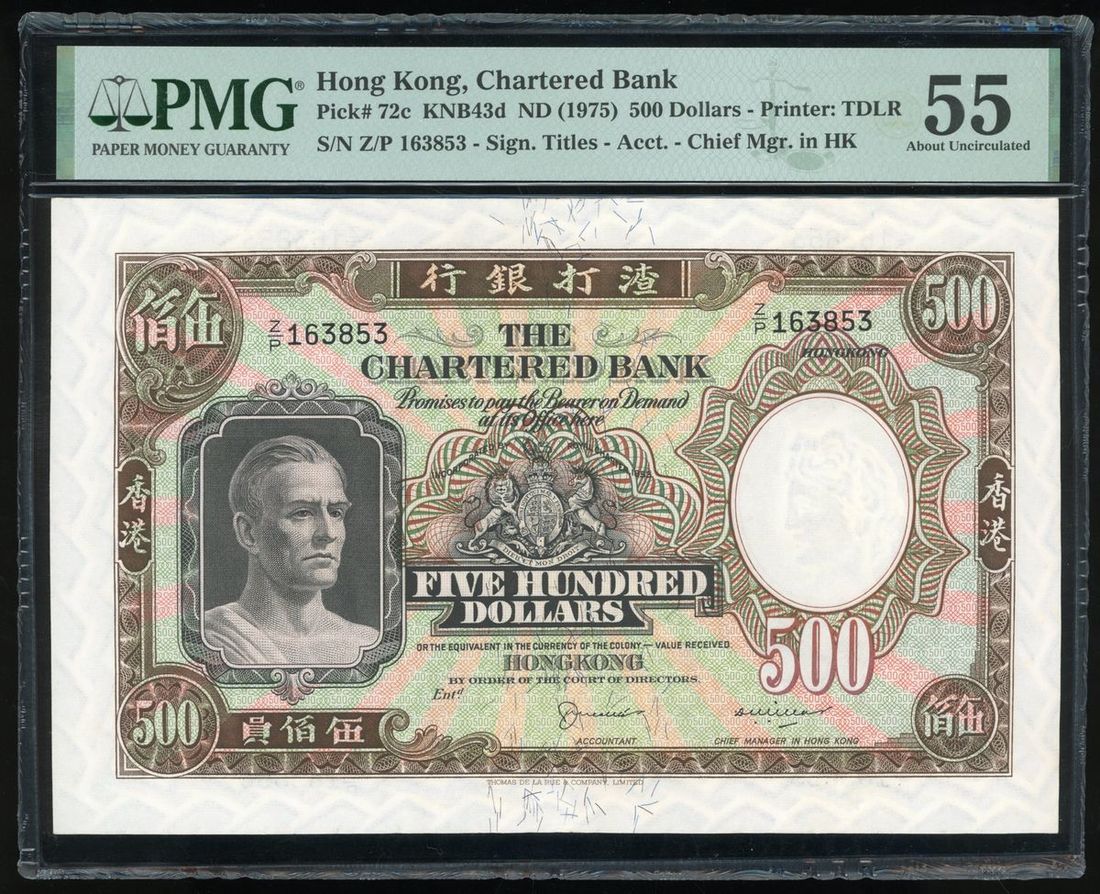 The Chartered Bank, Hong Kong, $500, ND(1975), serial number Z/P 163853, (Pick 72c), PMG 55 About Uncirculated. Note this is scarcer 1975 type, not the more commonly seen 1977 type.