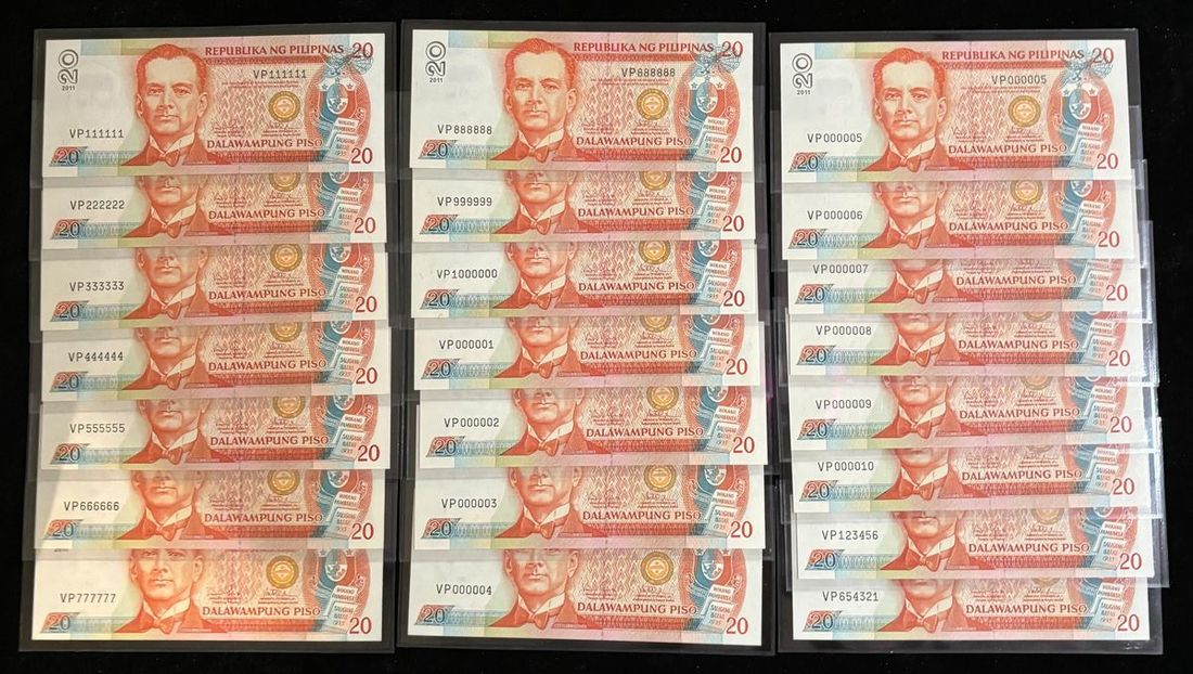 Bangko Sentral ng Pilipinas, The Philippines, a group of 22x 20 piso, 2011, a full set of fancy serial numbers including: VP 111111, 222222, 333333, 444444, 555555, 666666, 777777, 888888, 999999, 1000000, 000001, 000002, 000003, 000004, 000005, 000006, 000007, 000008, 000009, 000010, 123456 and 654321,