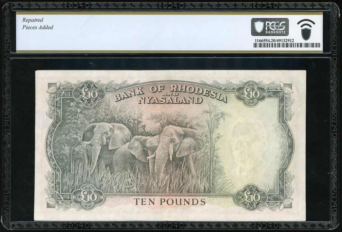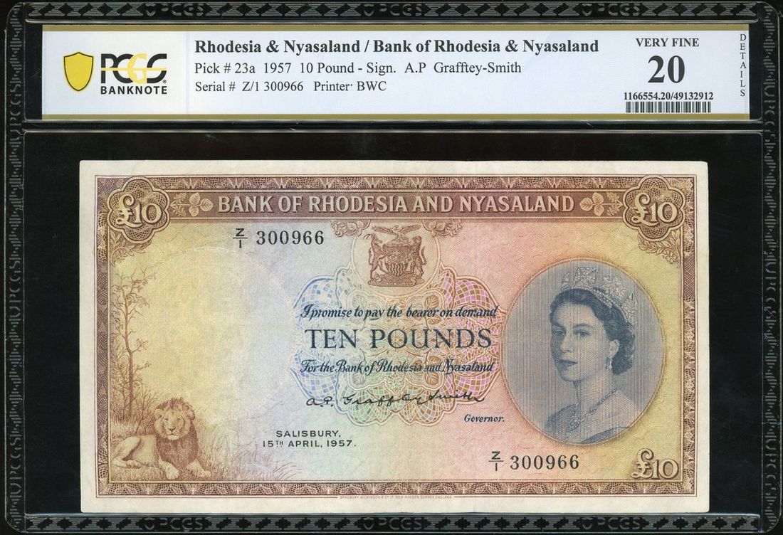 Bank of Rhodesia and Nyasaland, £10, 15.4.1957, serial number Z/1 300966, (Pick 23a), PCGS 20 DETAILS (repaired, pieces added), very fine. An iconic note from the whole Commonwealth series. Rare and sought after in any grade