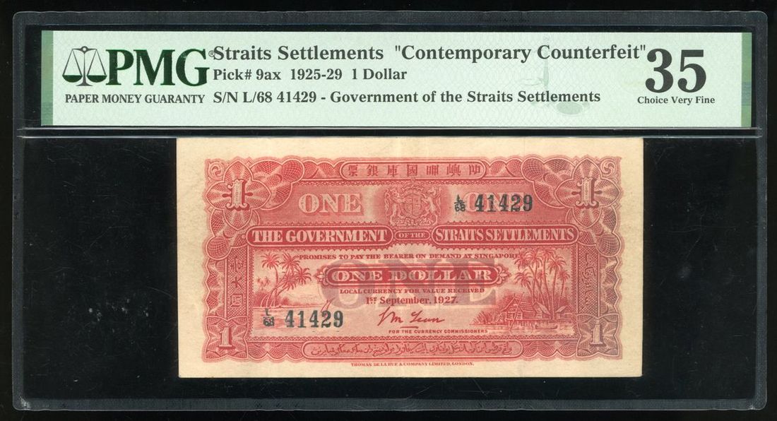 Straits Settlements, contemporary counterfeit $1, 1.9.1927, serial number L/68 41429, (Pick 9ax), PMG 35. Interesting and rarely seen