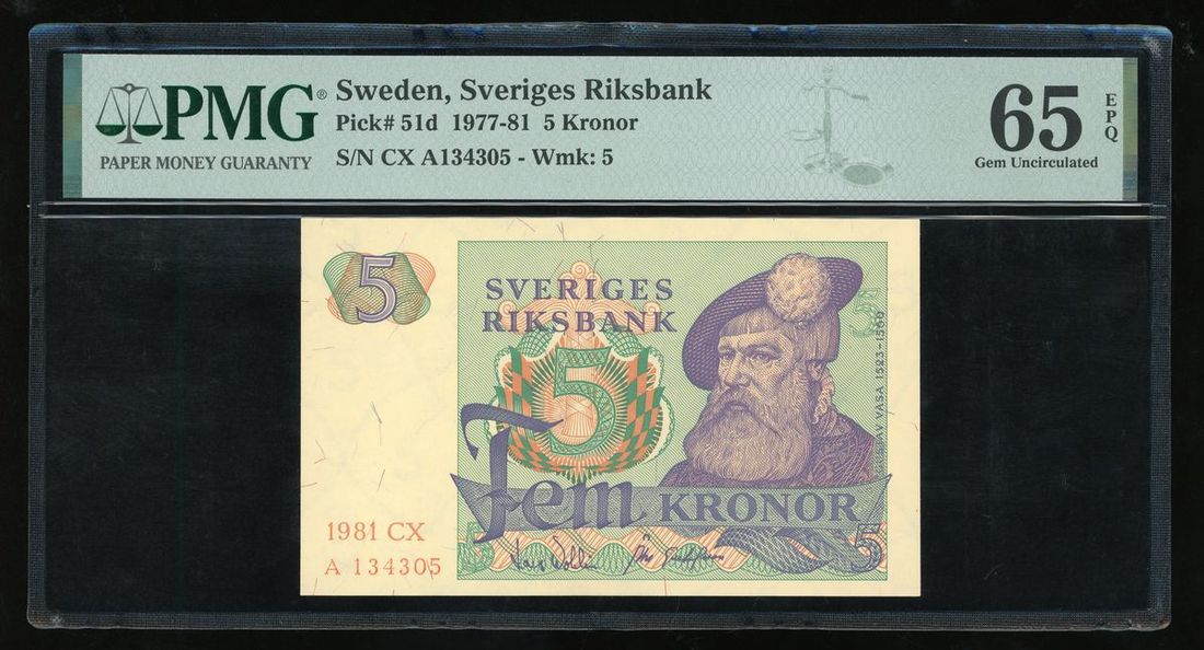 Sveriges Riksbank, Sweden, 5 kronor, 1981, serial number A 134305, (Pick 51d), PMG 65EPQ Gem Uncirculated