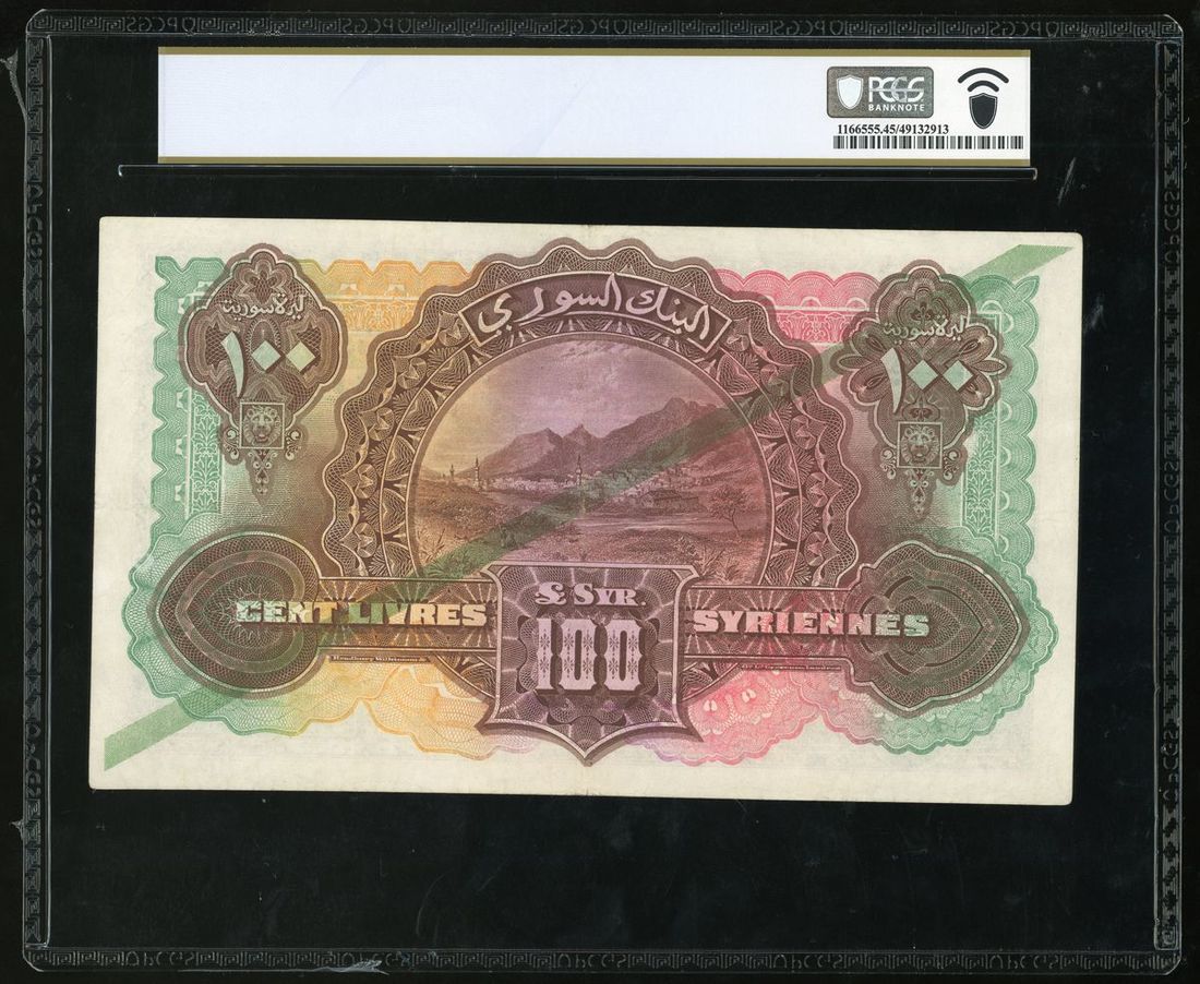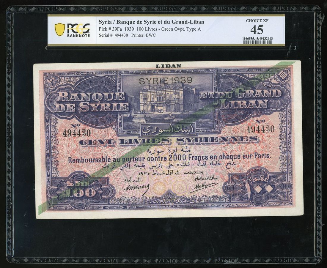 1939年100敘利亞鎊,編號494430,加蓋綠色斜線,PCGS 45,罕見高分美品,於PCGS評級紀錄中之唯一一枚,PMG評級紀錄中最高分為35分,高階紙幣藏家不容錯過!