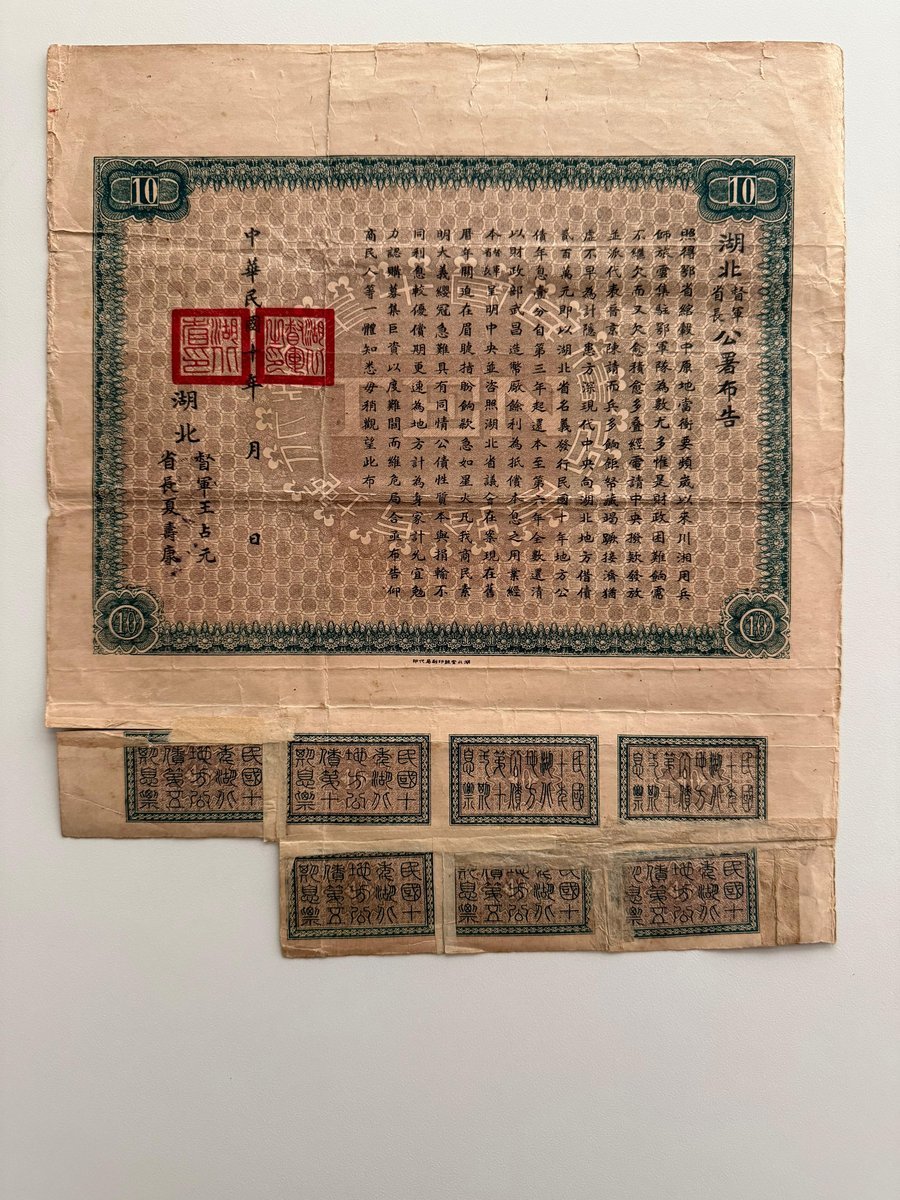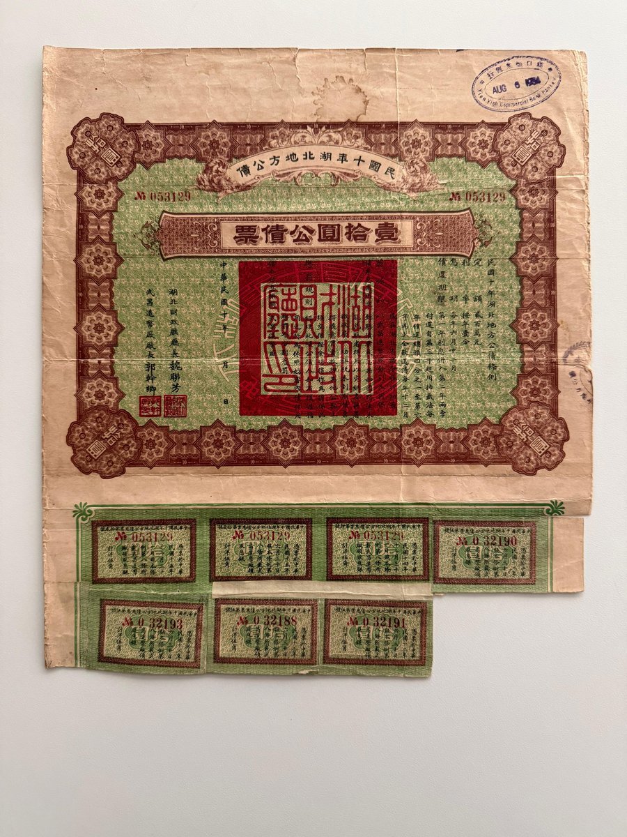 民國十年湖北地方壹拾圓公債票,編號053129,由湖北財政廳及武昌造幣廠聯合發行,附息票,稀有版別