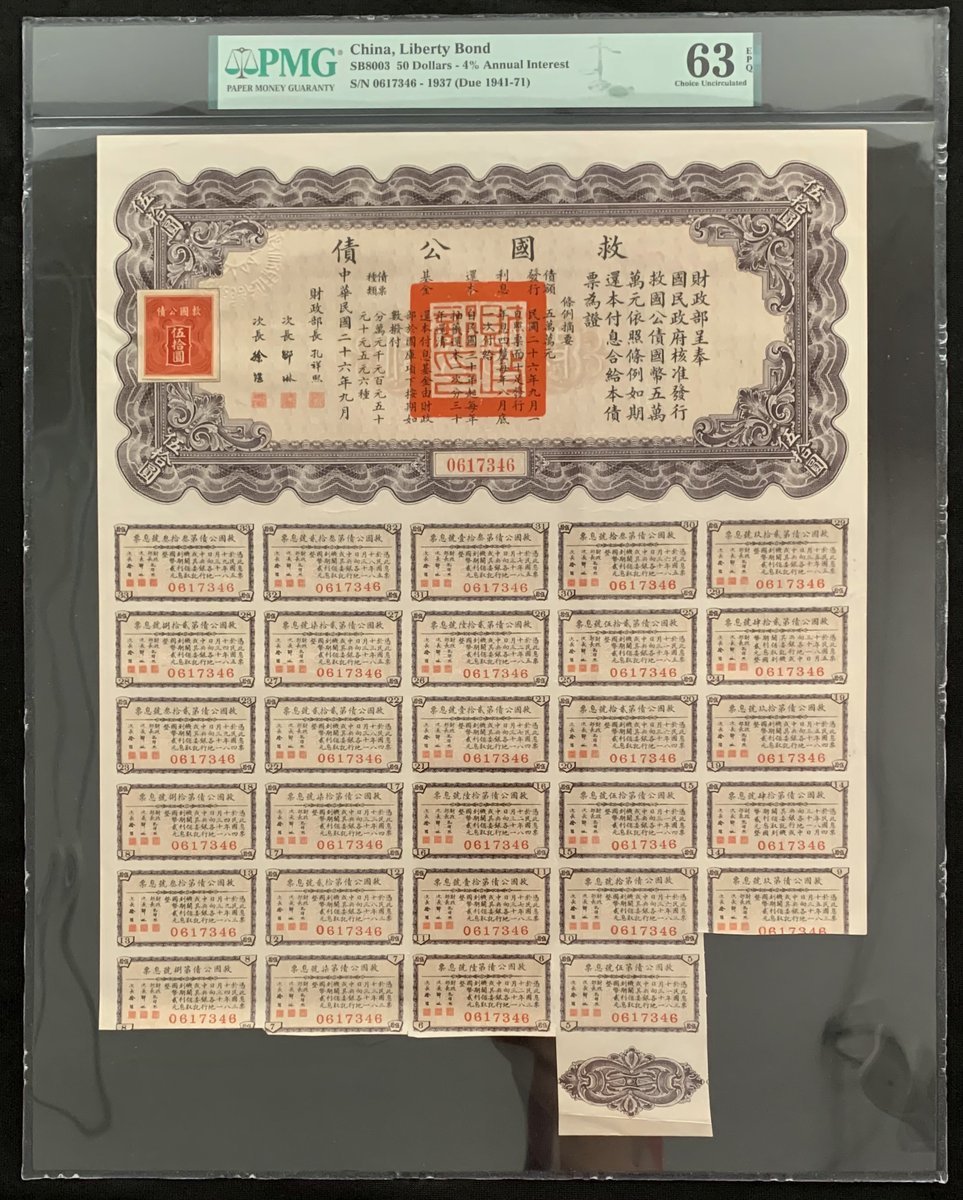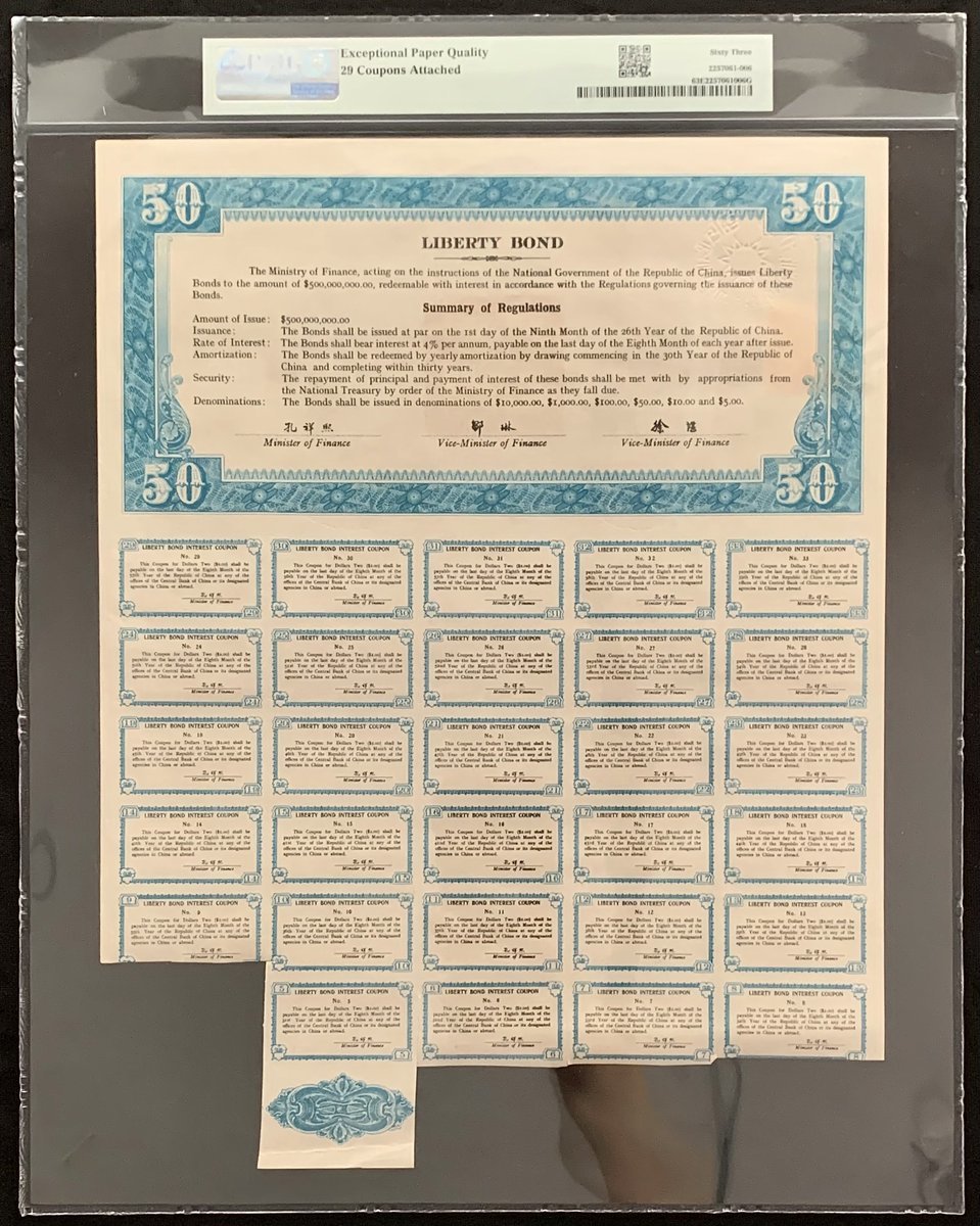 China, Year 26 (1937) Liberty Bond, $50, 4% annual interest, serial number 0617346, 29 coupons attached,