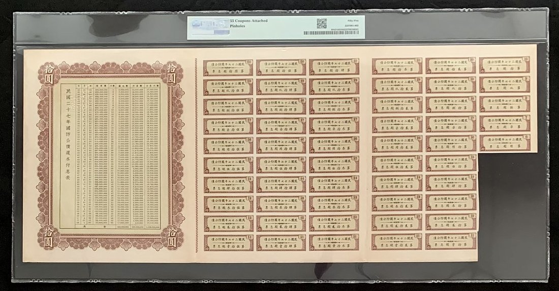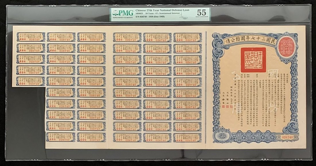 China, Year 27 (1938) National Defense Loan, 10 yuan, 6% Semi-annual interest, serial number 026740, with 55 coupons attached