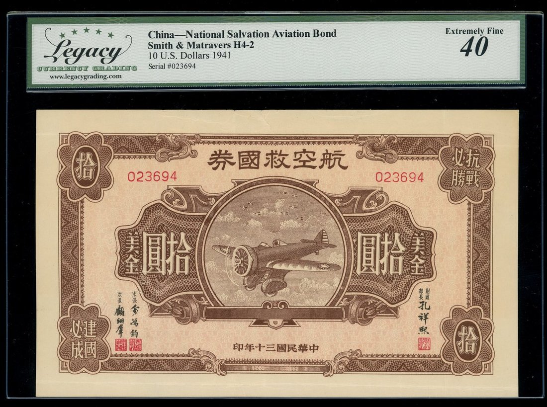 National Salvation Aviation Bond, U.S.$10, 1941, serial number 023694, brown on pink-brown, fighter aircraft at centre, reverse Chinese text,