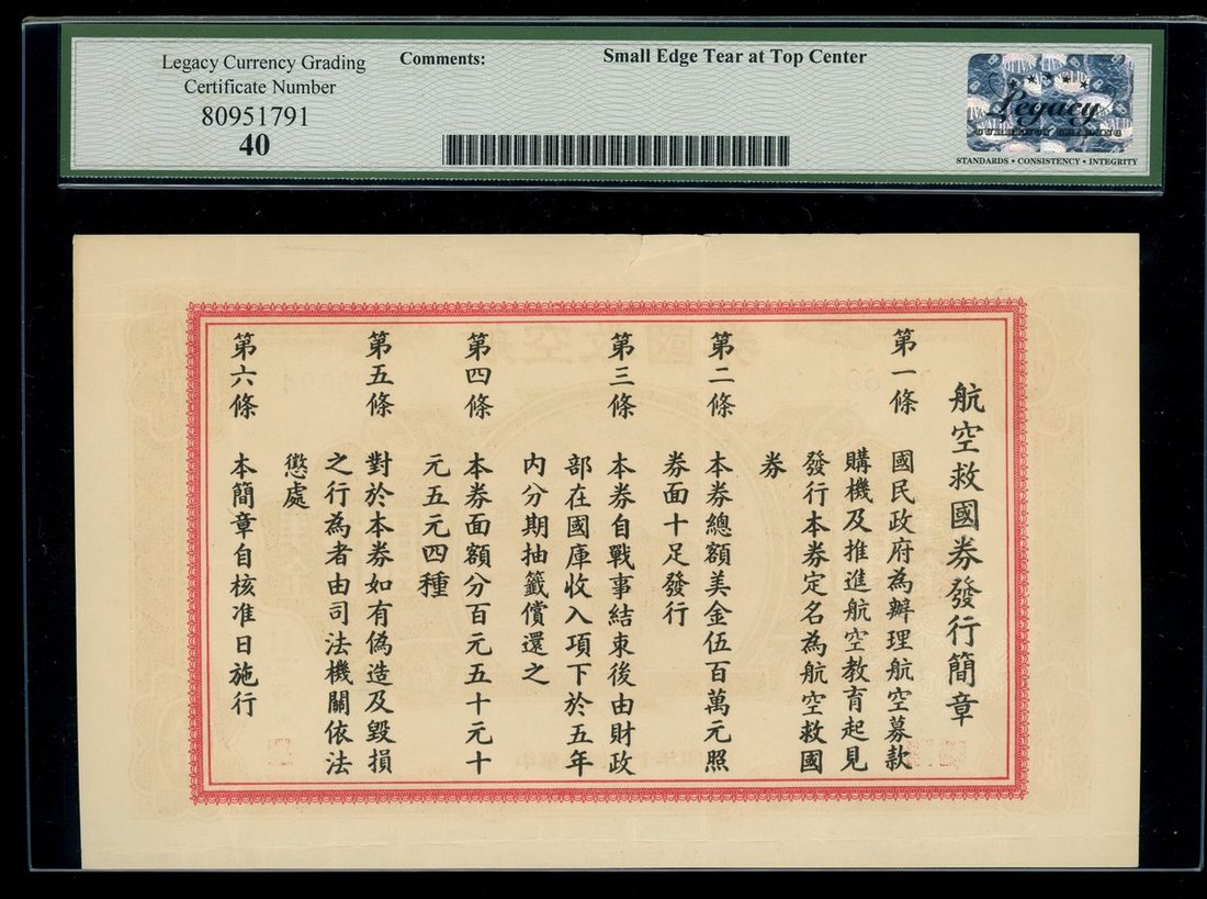 民國三十年航空救國券拾圓,編號023694,LCG 40