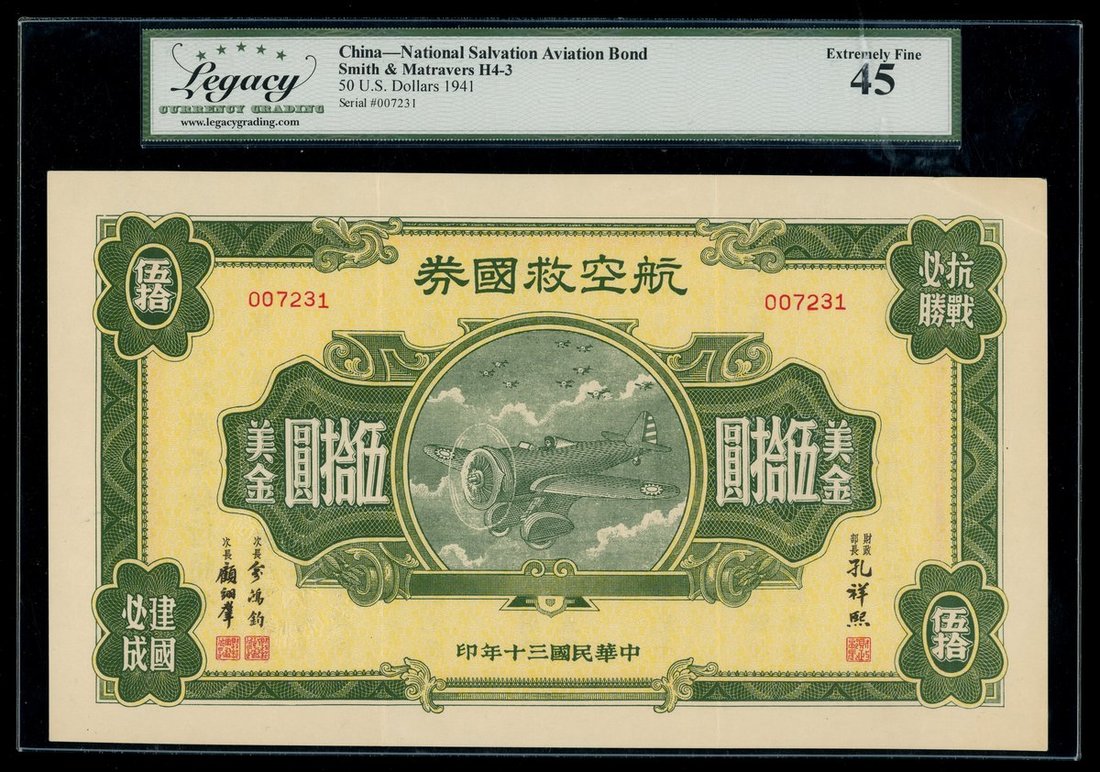 National Salvation Aviation Bond, U.S.$50, 1941, serial number 007231, green on yellow underprint, fighter aircraft at centre, reverse Chinese text,