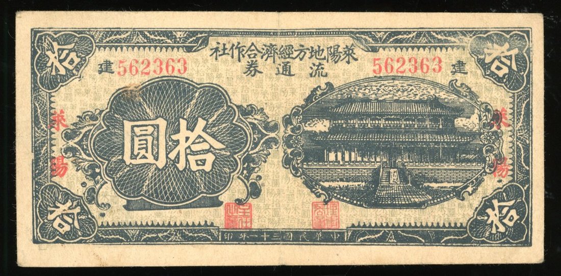 Lai Yang Economic Cooperative Certificate, China, 10 yuan, Year 31 (1942), serial number 562363, (Pick unlisted), very fine