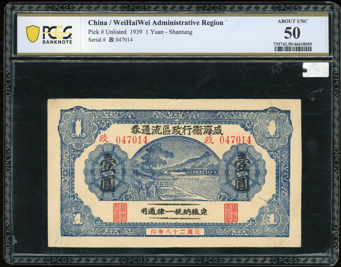 WeiHaiWei Administrative Region, China, 1 yuan, Year 28 (1939), Shantung, serial number 047014, (Pick unlisted), PCGS 50 about UNC, previously mounted