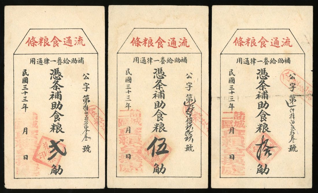 China, Circulating Food Coupons, Shandong, Zhucheng, a group of 3x, including, 2, 5 and 10 units, Year 33 (1944), generally extremely fine (3)