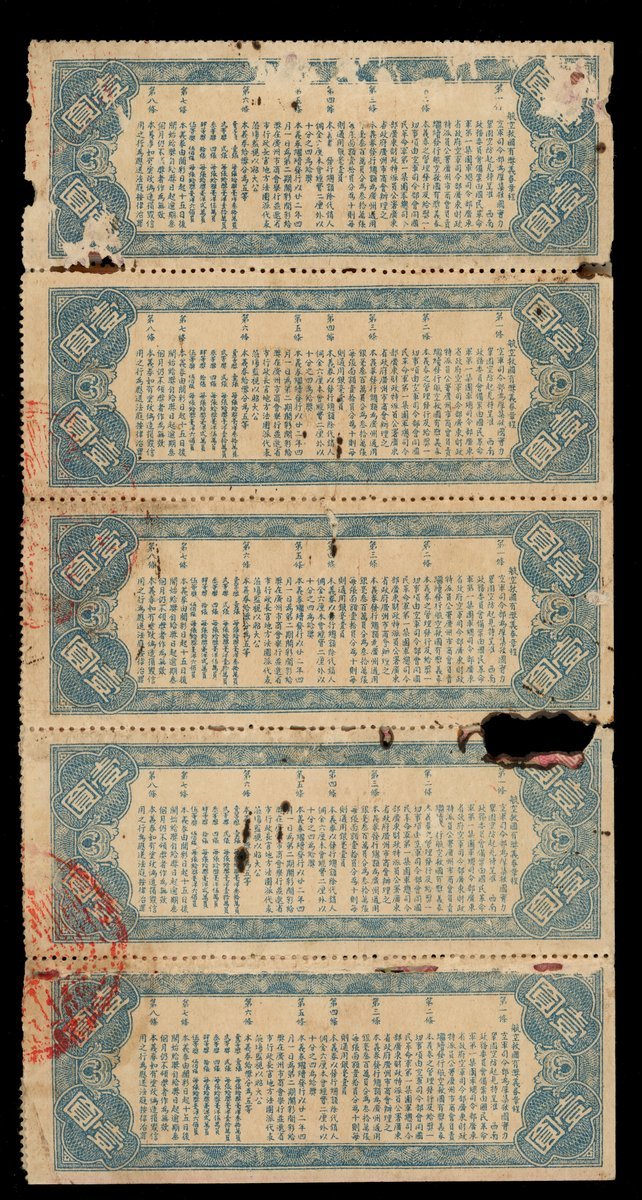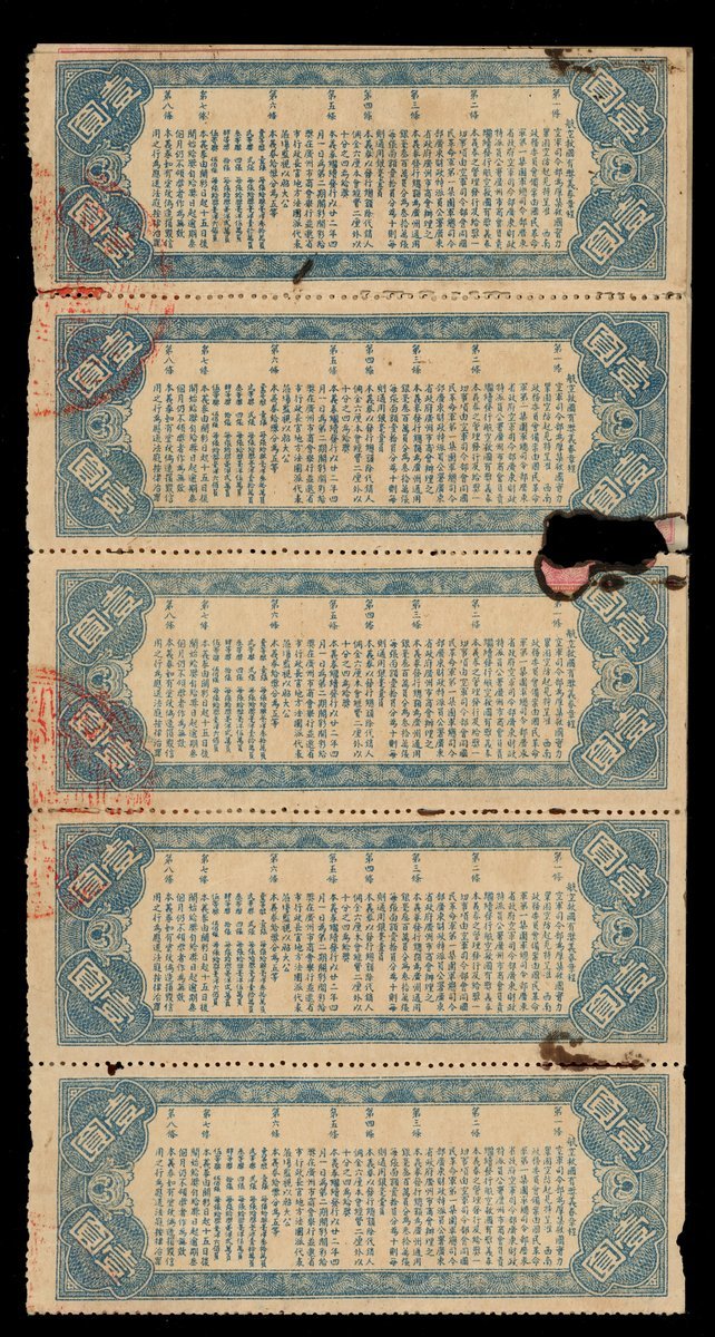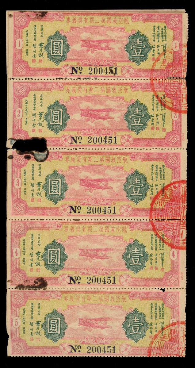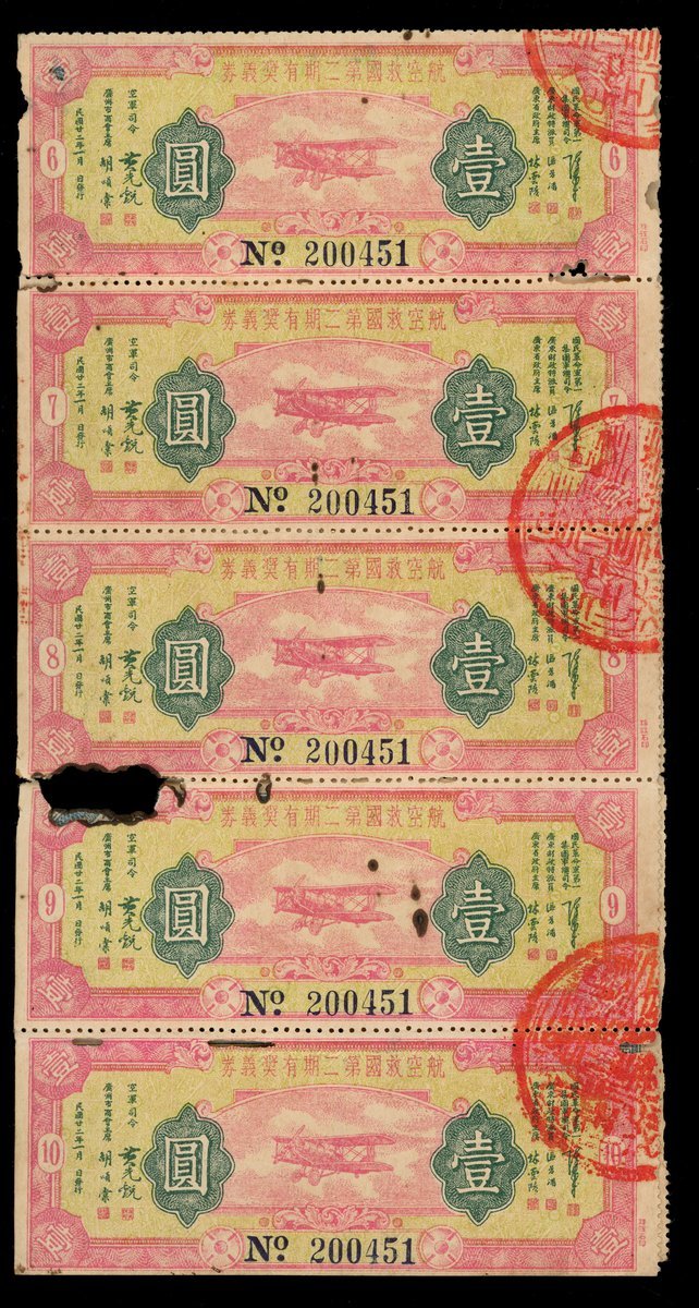The 2nd Phase National Salvation Lottery Tickets, 10x 1 yuan, 1933, 10 tickets with identical serial number 200451, red and yellow, airplane at centre,