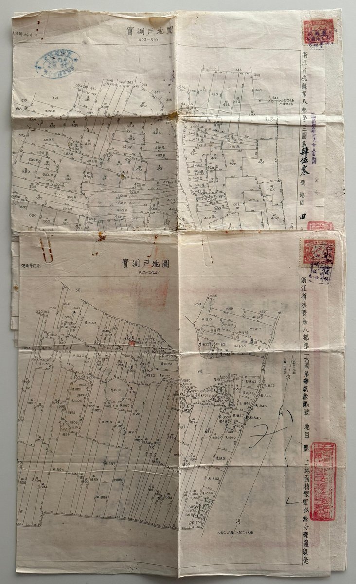 民國年間浙江省杭縣實測戶地圖一組2枚,當中一枚附有印花稅票,VF品相