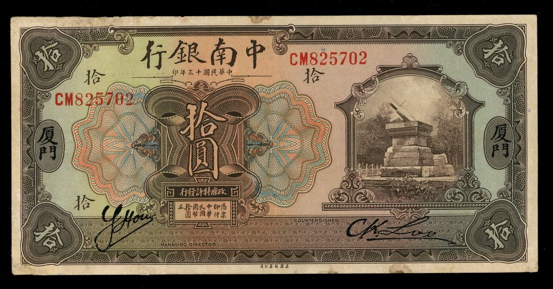 民國十三年中南銀行拾圓,廈門地名,編號CM 825702,gVF品相,有漬
