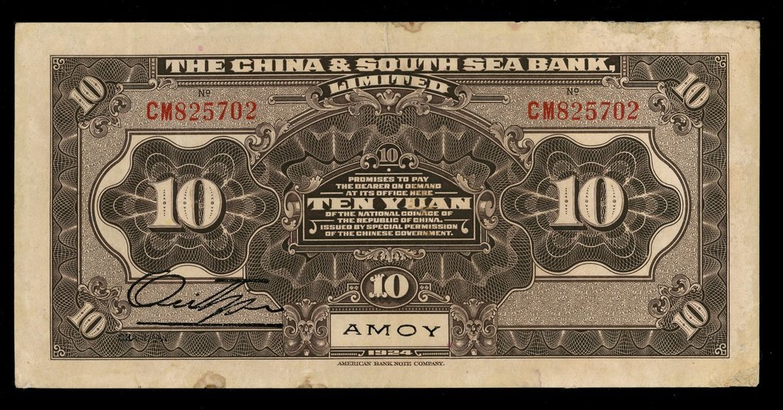The China & South Sea Bank, 10 yuan, 1924, Amoy, serial number CM825702, brown and multicolour underprint, sundial at right, reverse dark brown,