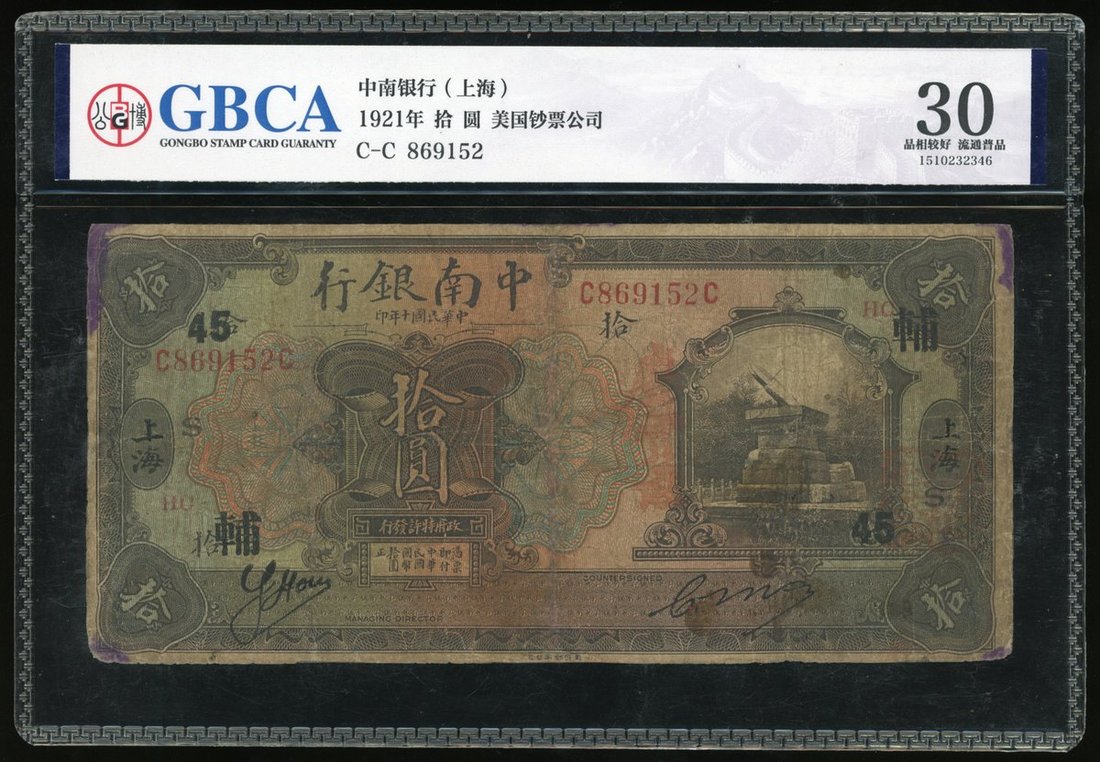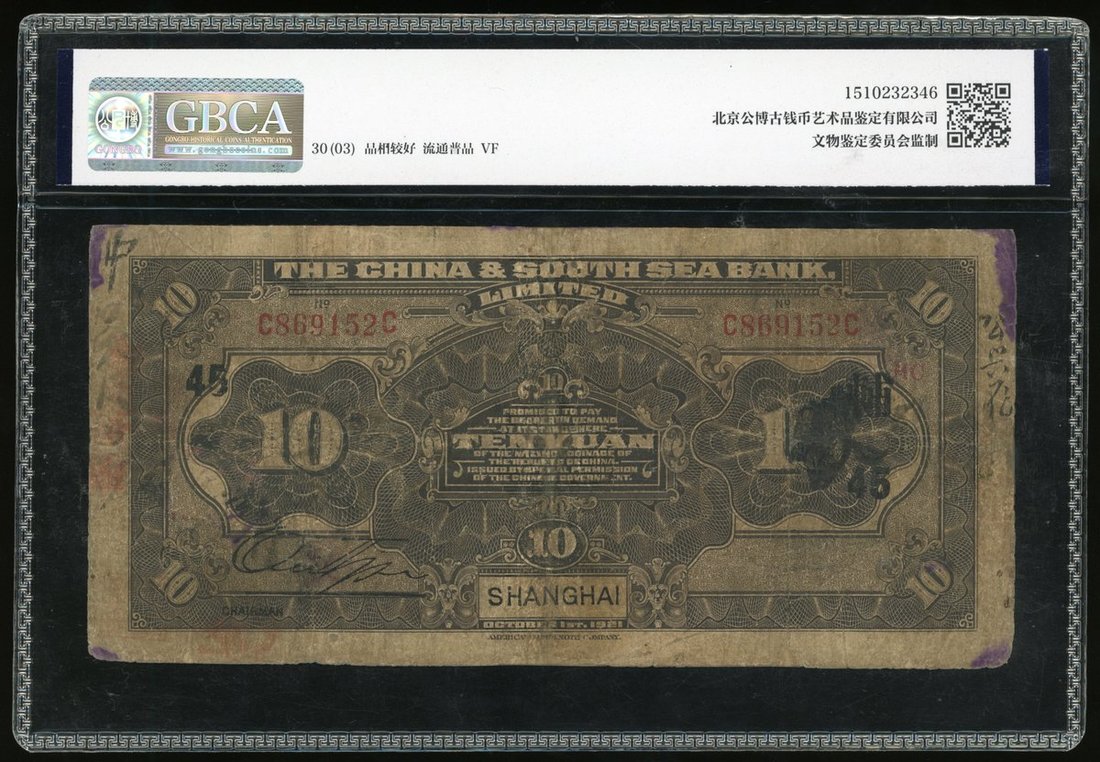 The China & South Sea Bank, 10 yuan, 1921, Shanghai, red serial number C869152C, black Chinese characters 'Fu' and Arabic number '45' overprinted,