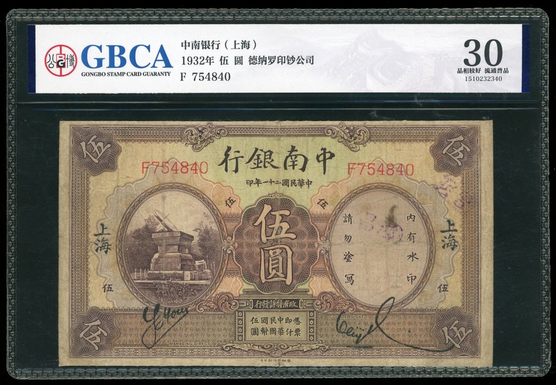 民國二十一年中南銀行伍圓,上海地名,編號F 754840,公博30,F品相,有孔、筆註及印戳