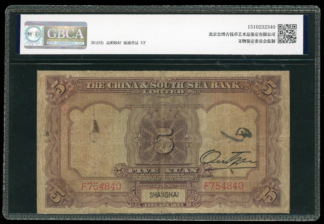 The China & South Sea Bank Limited, 5 yuan, 1932, Shanghai, serial number F 754840, (Pick A133), Fine, Holes, Annotations and Ink Stamps, GBCA 30