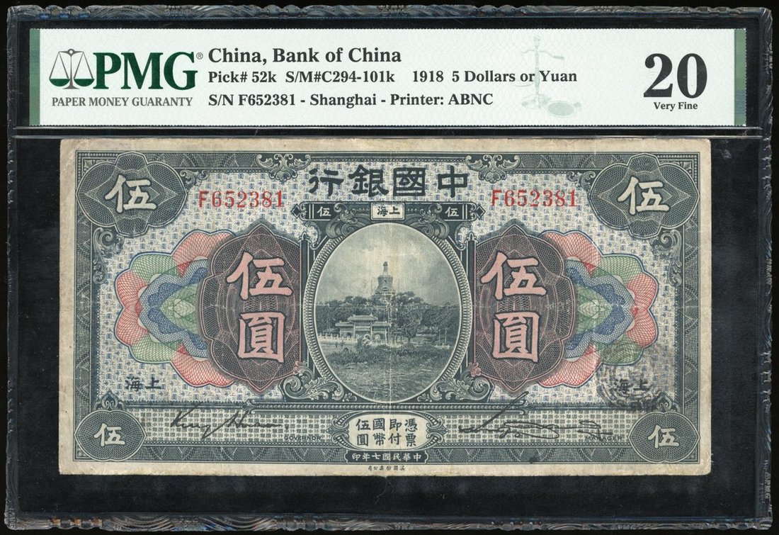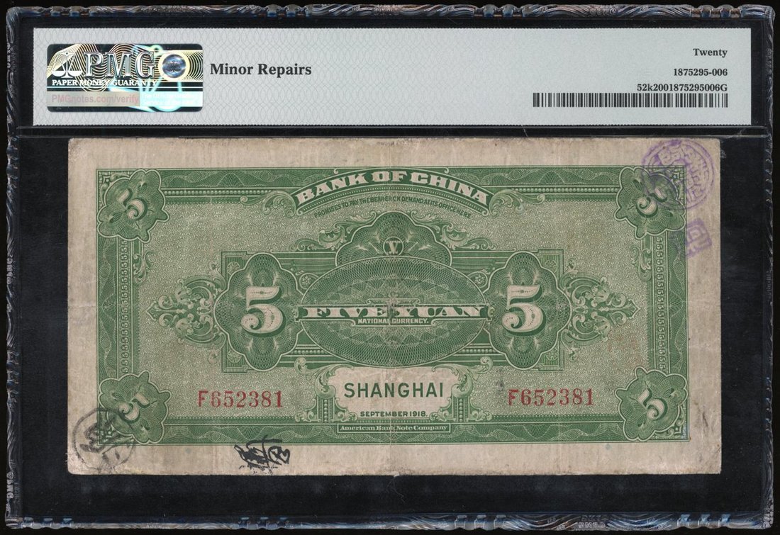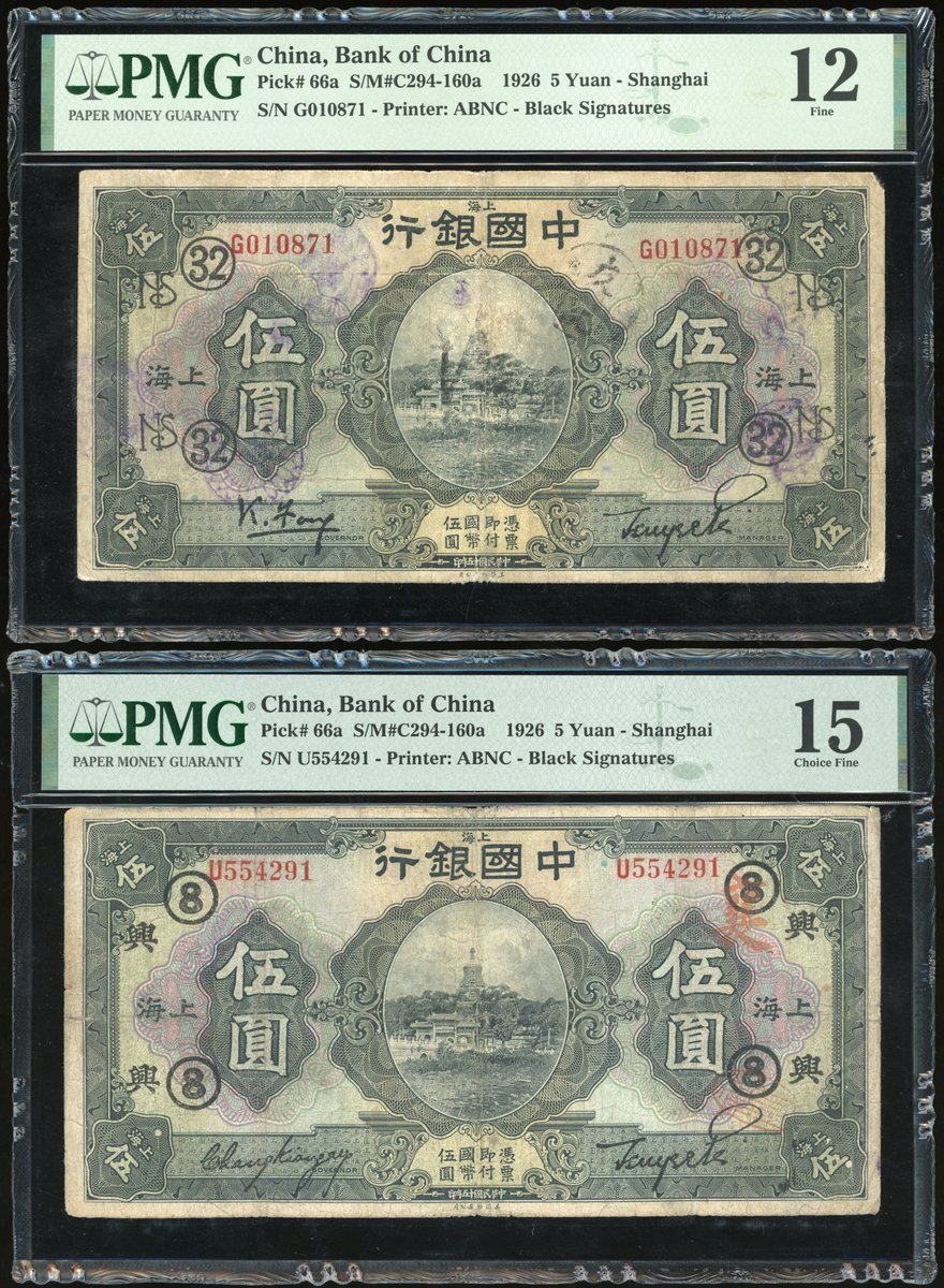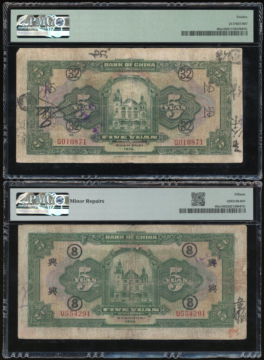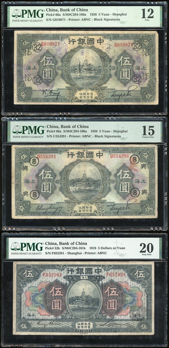Bank of China, 5 yuan (3), 1918, 1926, Shanghai, (Pick 52k, 66a), PMG 20 (minor repairs), 12, 15 (minor repairs) (3)