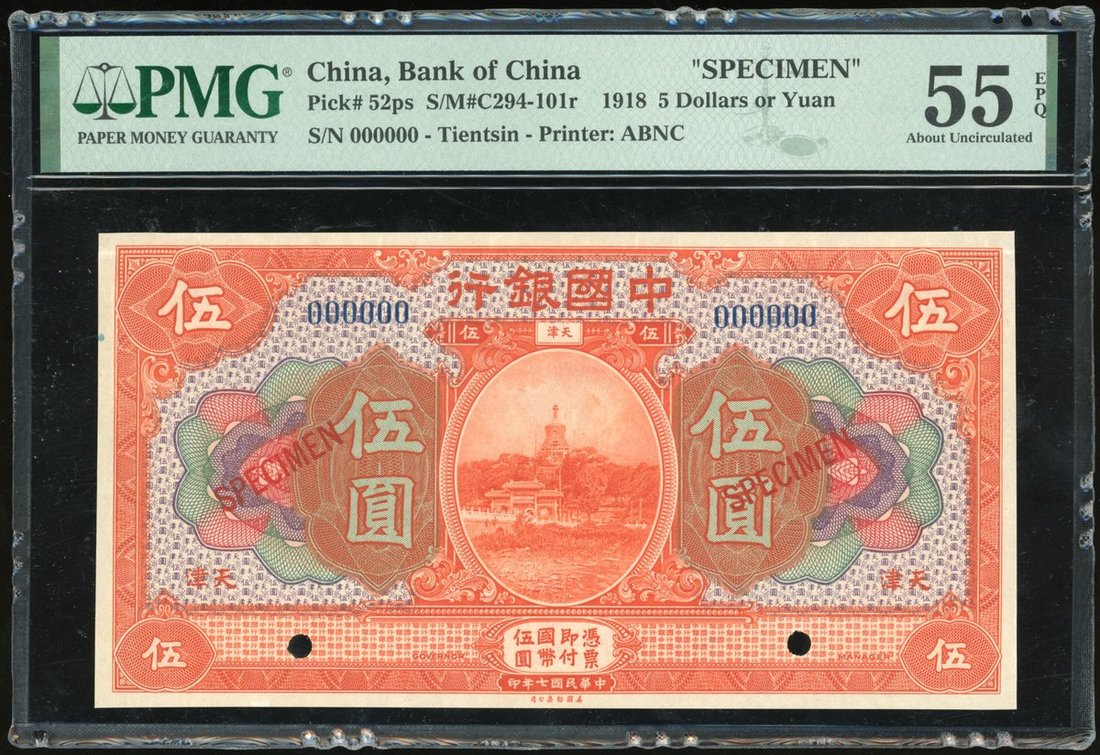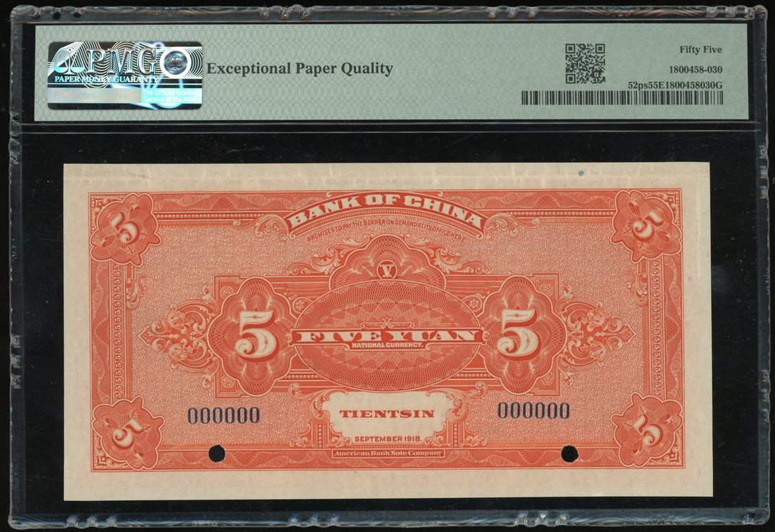 民國七年中國銀行伍圓樣票,天津地名,編號000000,PMG 55EPQ