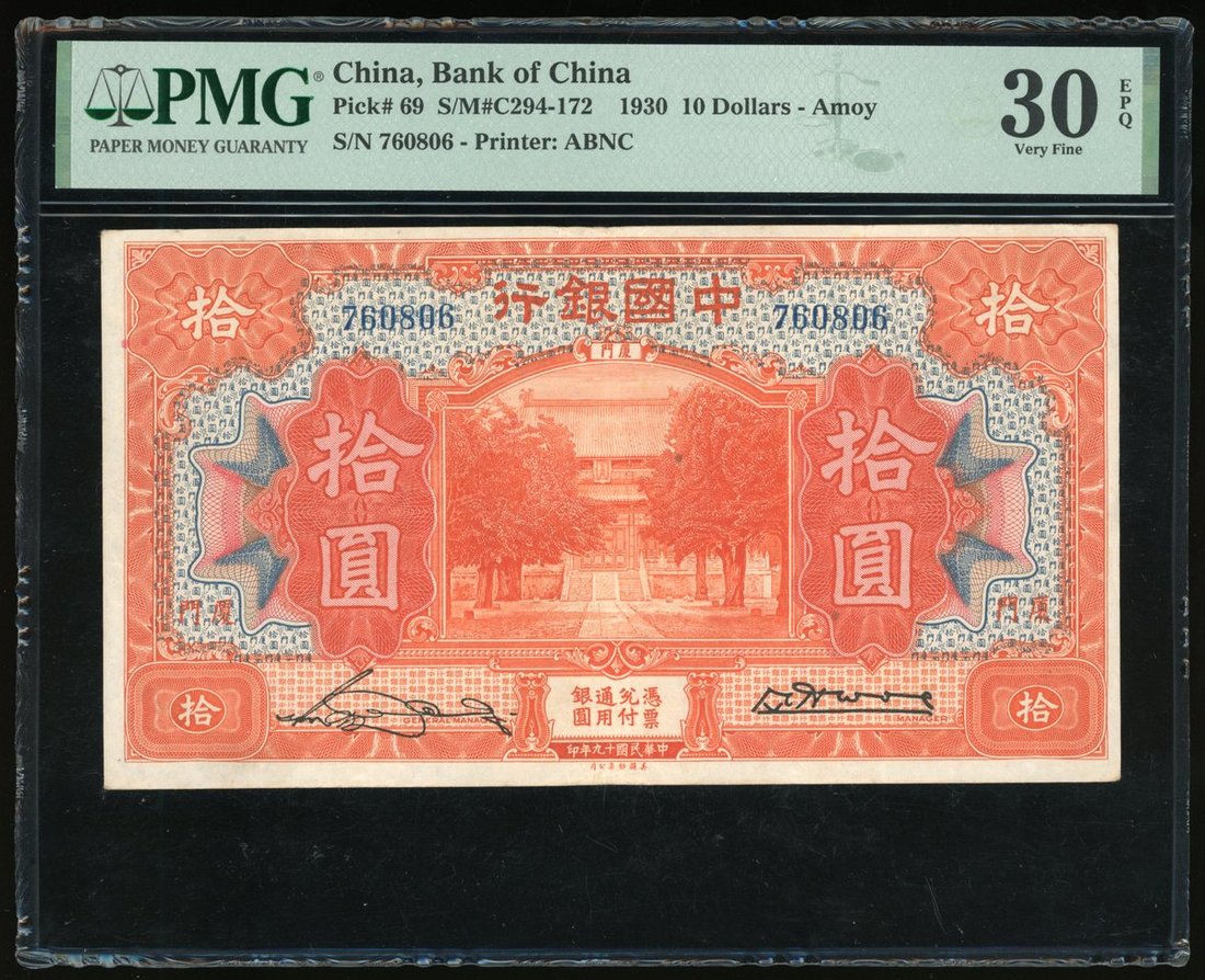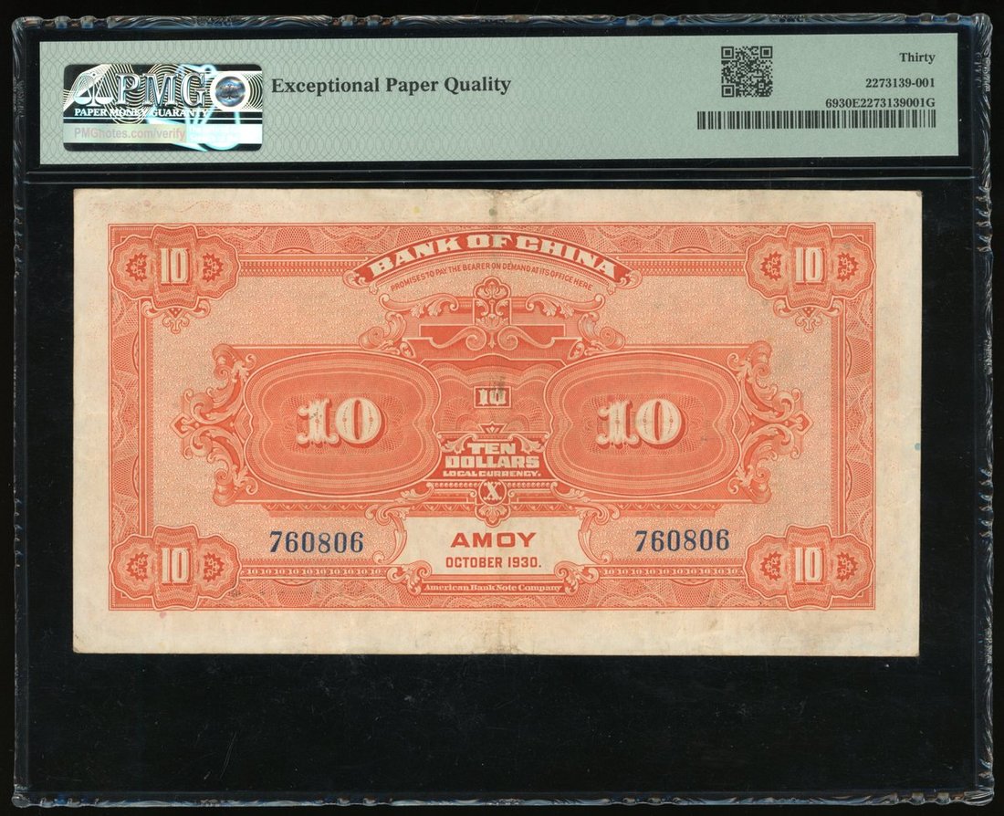 Bank of China, $10, 1930, Amoy, serial number 760806, (Pick 69), PMG 30EPQ Very Fine