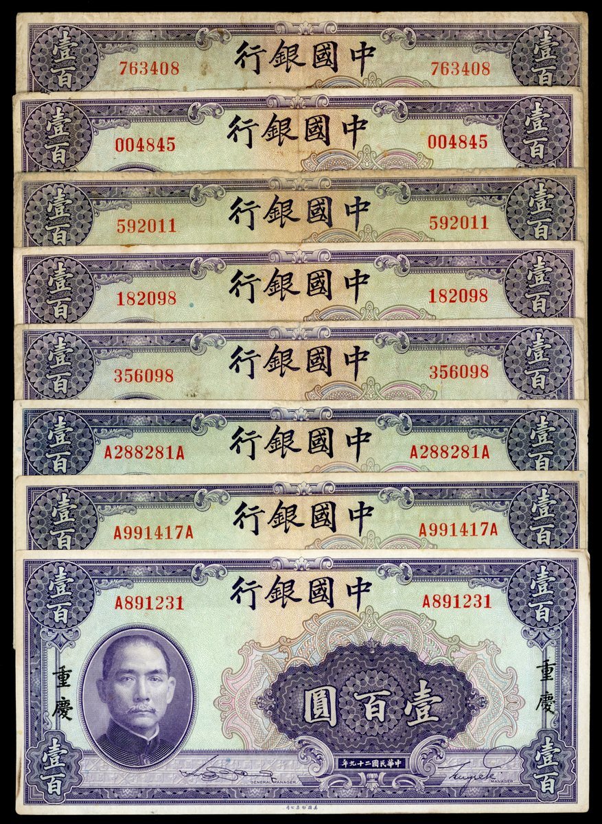 民國二十九年中國銀行壹百圓一組8枚,重慶地名,不同版式,大致VF或以上品相