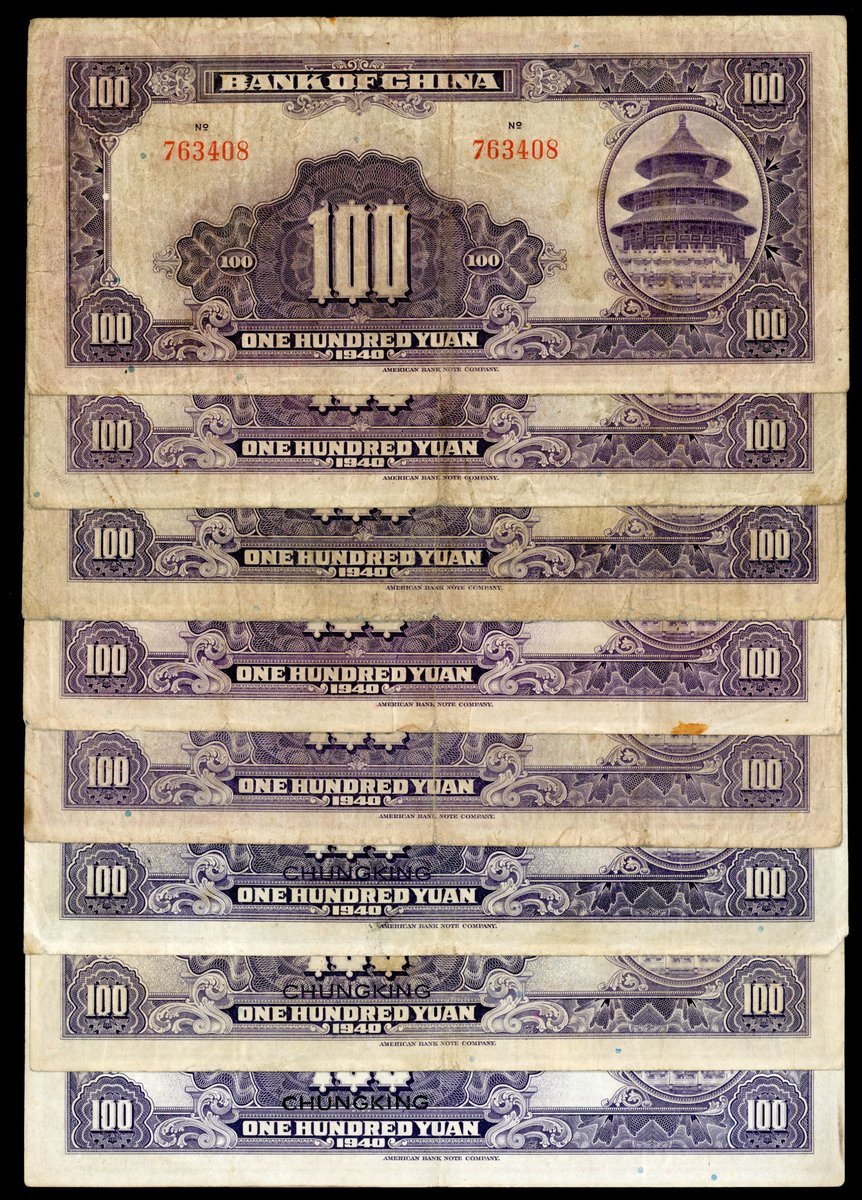 Bank of China, 100 yuan (8), 1940, Chungking, various types, (Pick 88a), generally very fine or better (8)