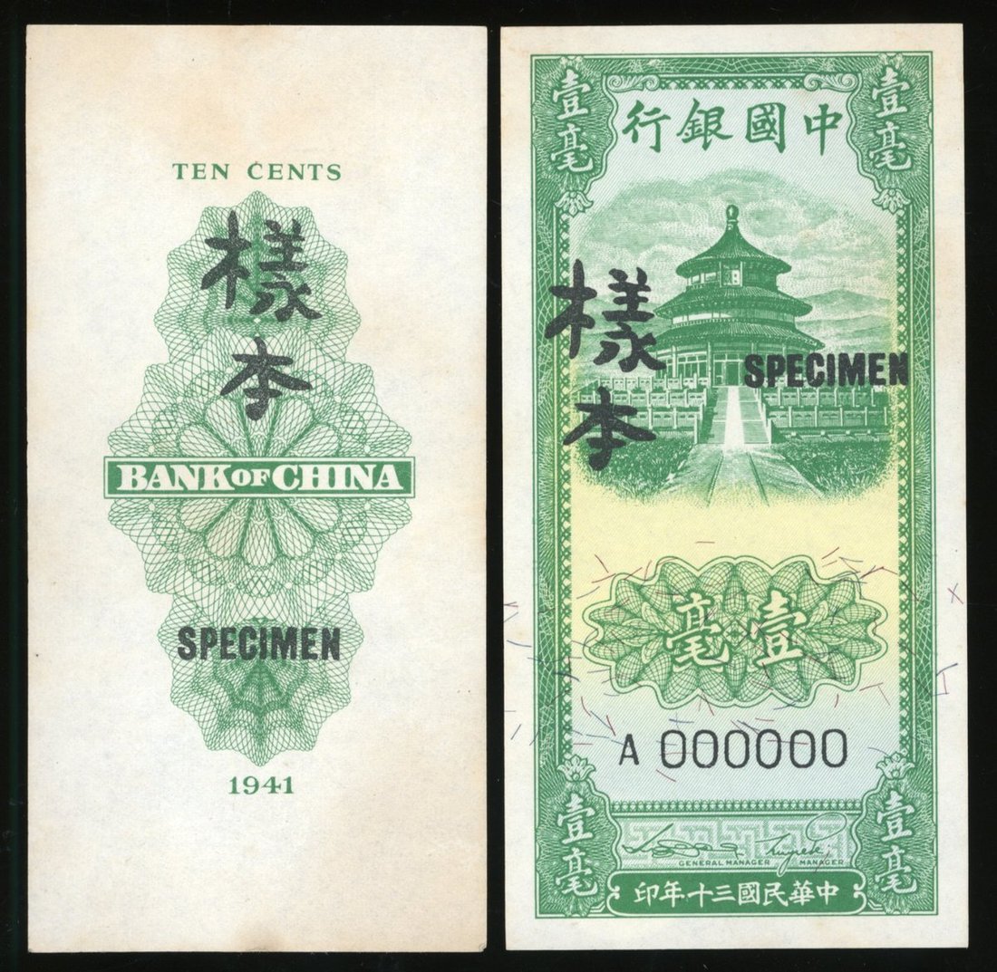 Bank of China, obverse and reverse specimen for 10 cents, Year 30 (1941), uniface,
