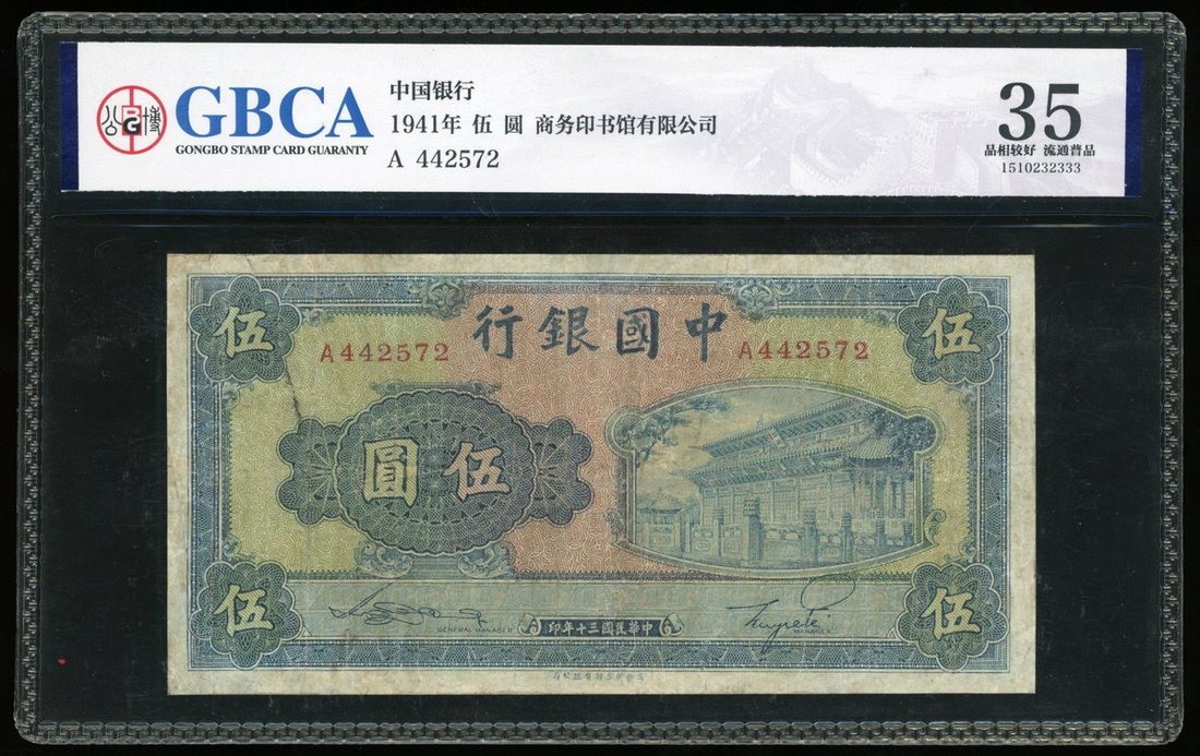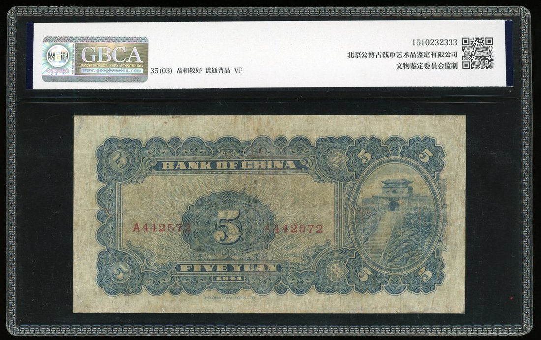 Bank of China, 5 yuan, 1941, red serial number A442572, (Pick 93), colour faded, margins stained, About Fine, GBCA 35