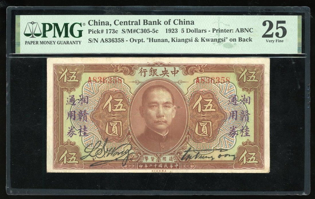 Central Bank of China, 5 yuan with 'Hunan, Kiangsi & Kwangsi' overprint, Year 12 (1923), serial number A836358, (Pick 173c), PMG 25, faded overprint. PMG Census with only 1 better, second highest grade. Quite rare