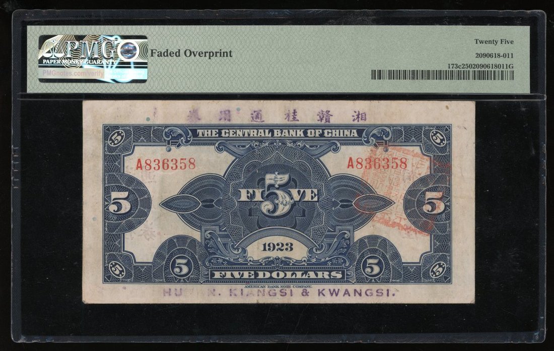 民國十二年中央銀行湘贛桂通用券伍圓,編號A836358,PMG 25,蓋印褪色,PMG評級紀錄中之亞軍分,僅有1枚獲評更高分,相當稀有