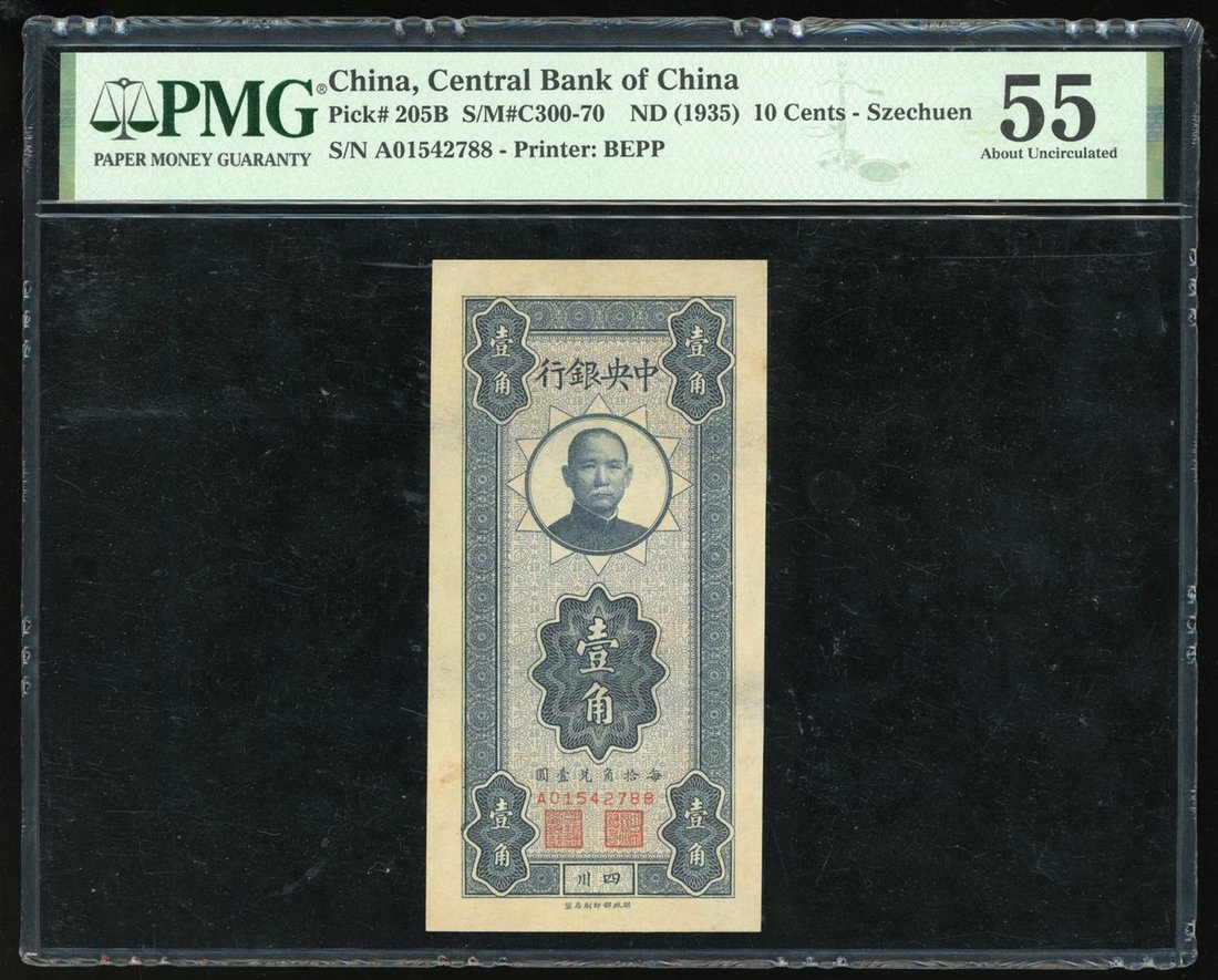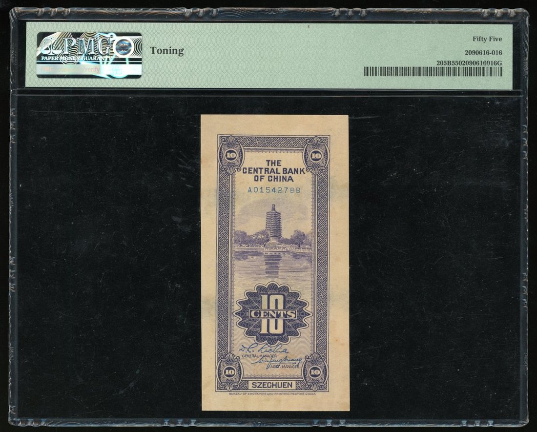 民國二十四年中央銀行壹角,四川地名,編號A01542788,PMG 55,有黃。四川版本均頗為稀有,此枚品相尤其出色