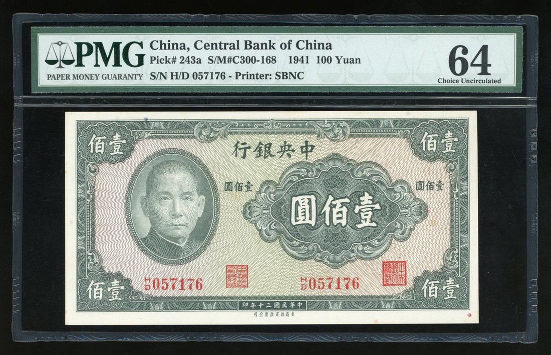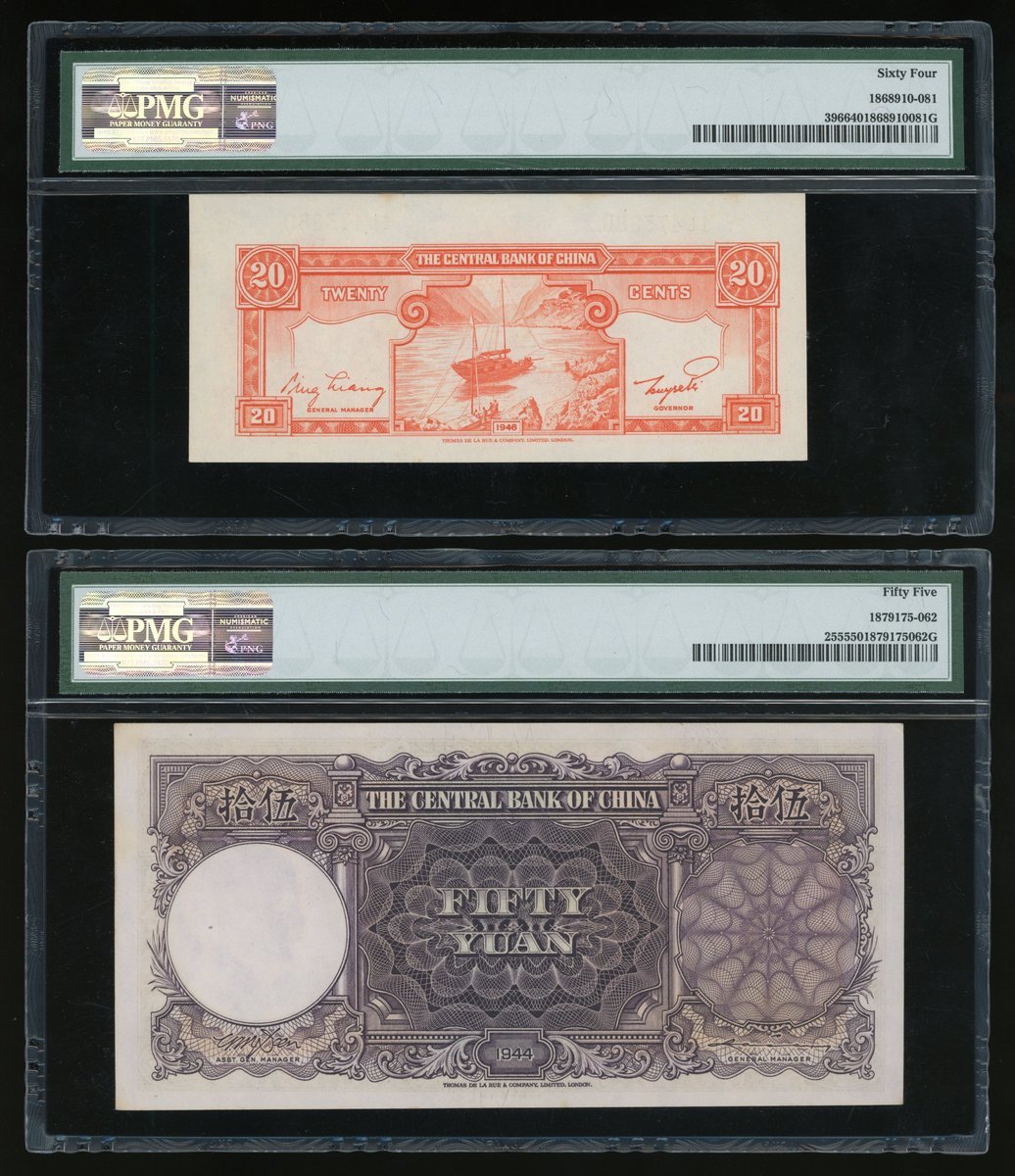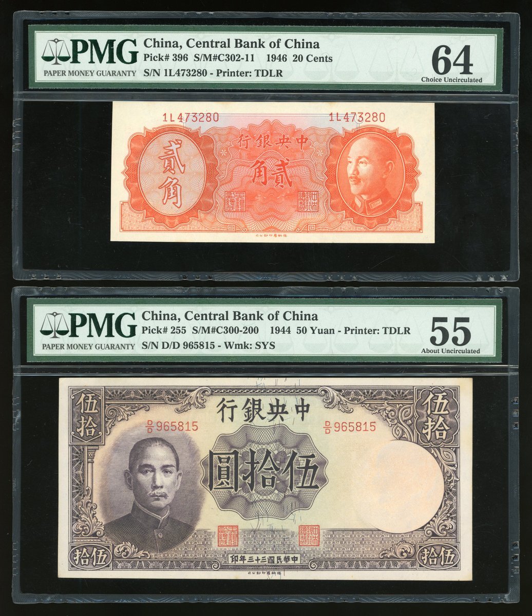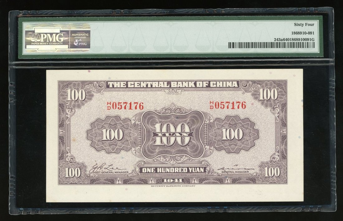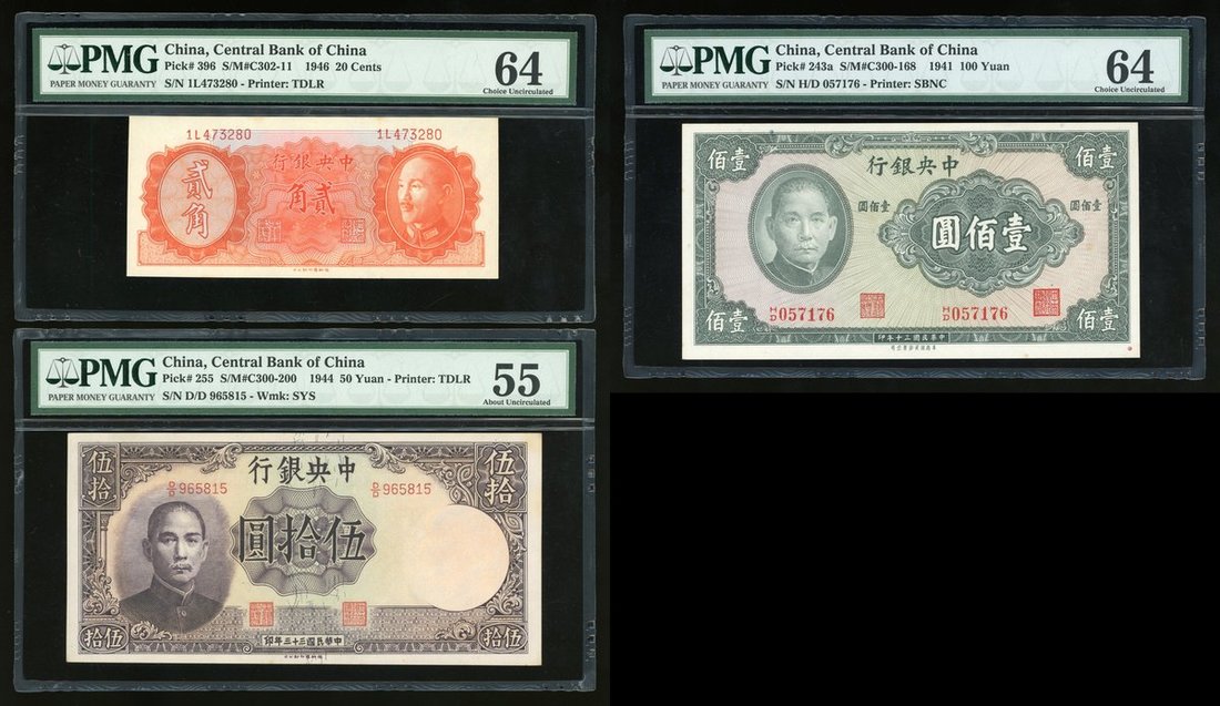Central Bank of China, a lot of 20 cents, 50 and 100 yuan, 1946, 1944 and 1941 respectively, serial number 1L473280, D/D965815, HD057176, (Pick 396, 255, 243a), PMG 64, 55 and 64 respectively.(3)