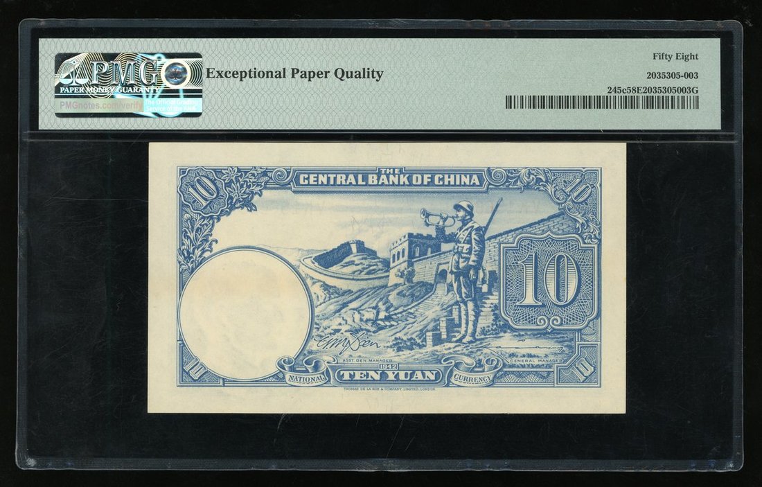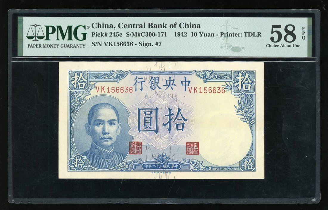 Central Bank of China, 10 yuan, 1942, serial number VK 156636, (Pick 245c), PMG 58EPQ Choice About Uncirculated