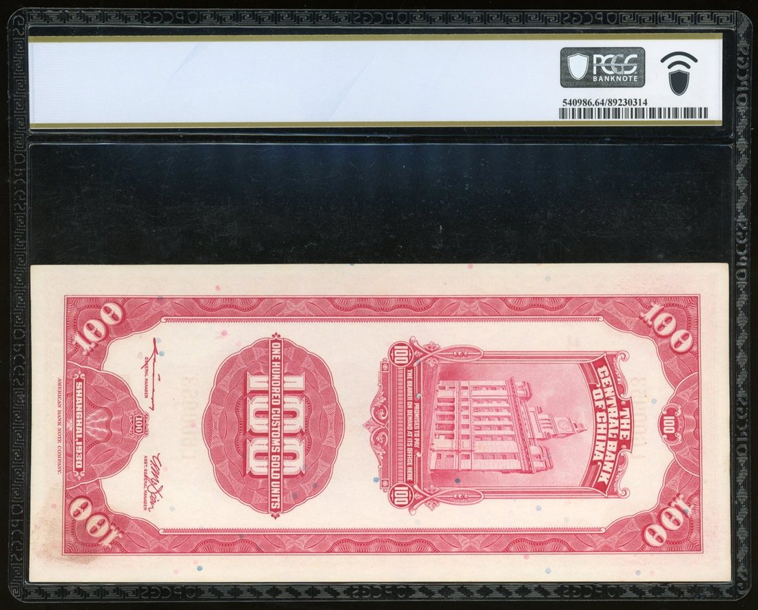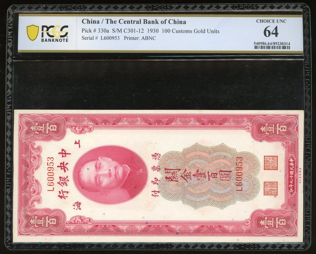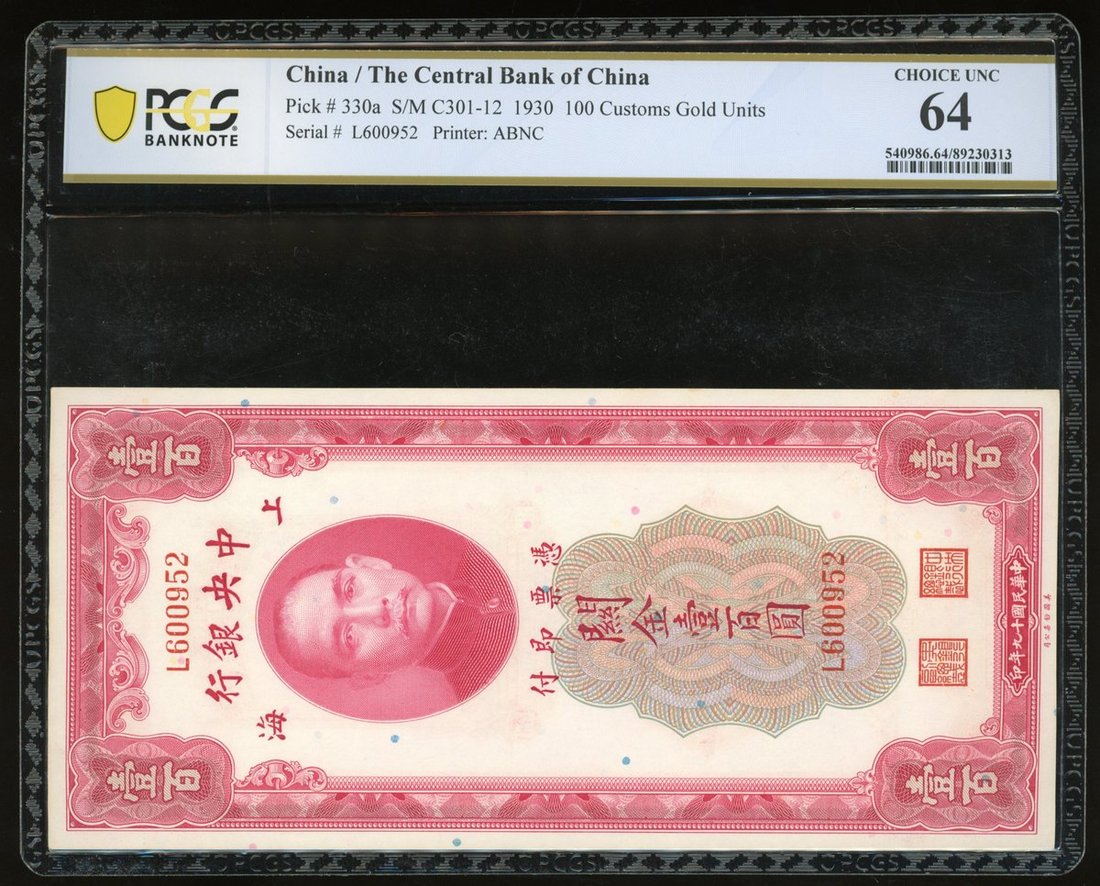 Central Bank of China, consecutive pair 100 customs gold units, 1930, serial number L600952/3, (Pick 330a), both PCCS 64 (2)